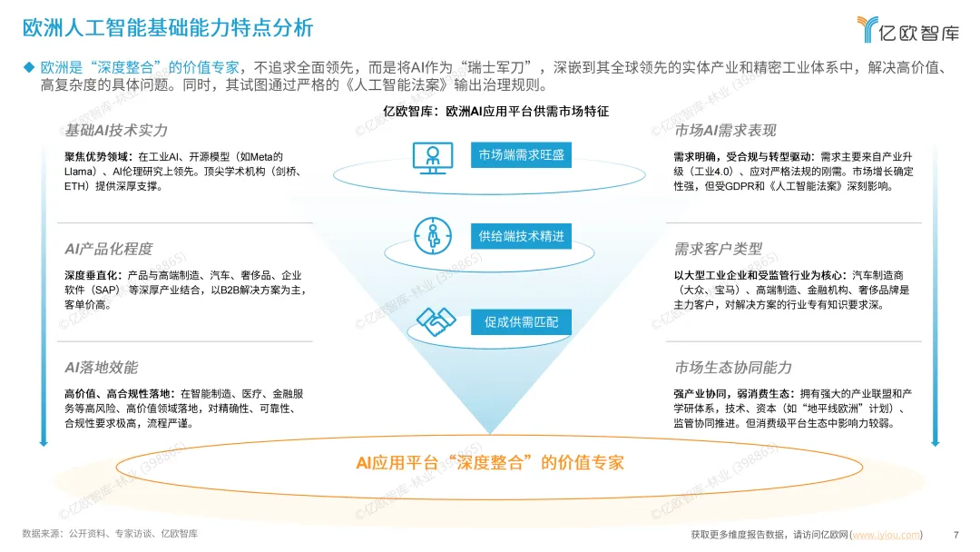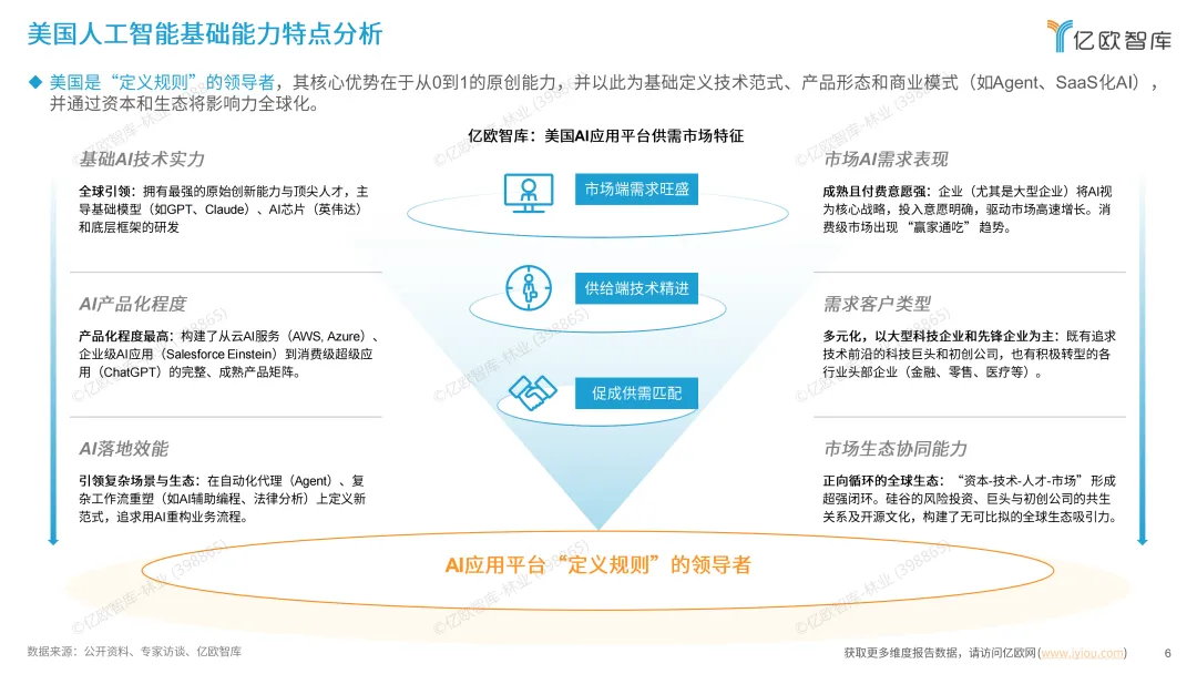 美国凭借顶尖人才与原始创新力领跑,聚焦基础超级模型及底层框架研发,依托硅谷生态形成资本、巨头与初创公司共生的良性闭环,GPT-5、Claude Opus等头部模型持续引领技术迭代。欧洲深耕合规与垂直领域,借《人工智能法案》输出全球治理规则,在高端制造、医疗等领域实现精准适配,靠产学研联盟筑牢优势但消费级生态薄弱。中国走应用驱动路线,计算机视觉、语音识别等应用层技术与工程化能力突出,依托庞大市场和政策引导构建本土产业闭环,只是基础模型与芯片领域仍在追赶。