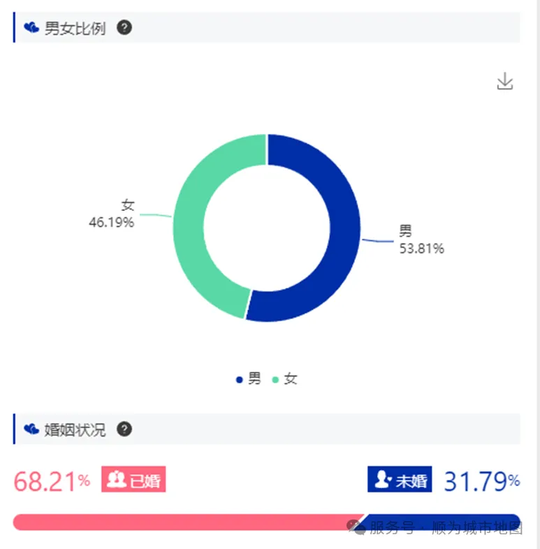 从年龄结构看,25~34岁和35~44岁的年轻与中年群体占据了主要地位,这表明该区域的消费群体以年轻人和中年人居多,具有较强的消费潜力,尤其在餐饮、零售、休闲娱乐等领域的需求较为旺盛。