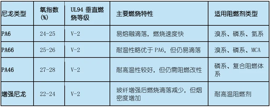表:不同类型尼龙的基础阻燃性能对比