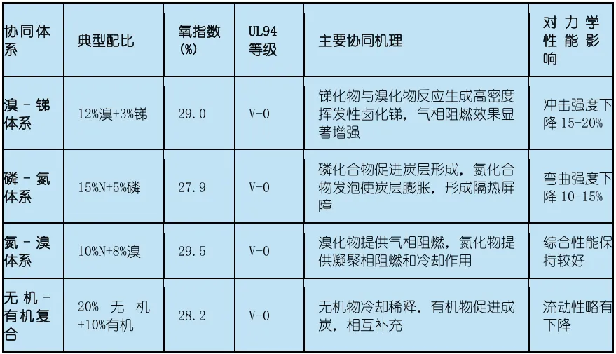 单一阻燃剂往往难以在阻燃效率、材料性能和成本之间取得理想平衡,因此协同阻燃体系成为尼龙阻燃改性的重要发展方向。协同效应是指两种或多种阻燃剂组合使用时,其总体阻燃效果超过各自单独使用时的效果之和。