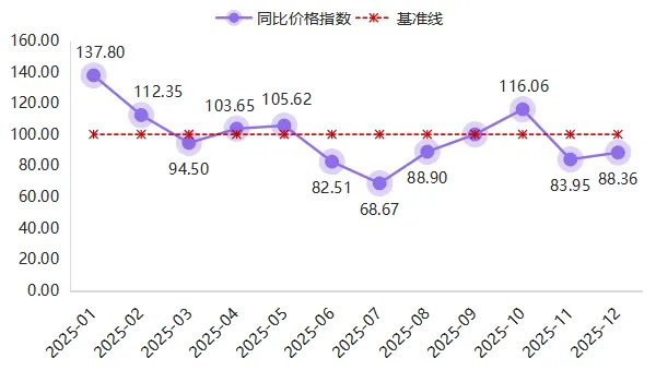 2025年山竹类同比价格指数波动幅度较大,整体呈现先高后低再回升的态势。1月指数即达到最高137.80点,7月达到最低点68.67点,12月为88.36点。从全年走势看,山竹类同比价格指数可分为三个阶段: