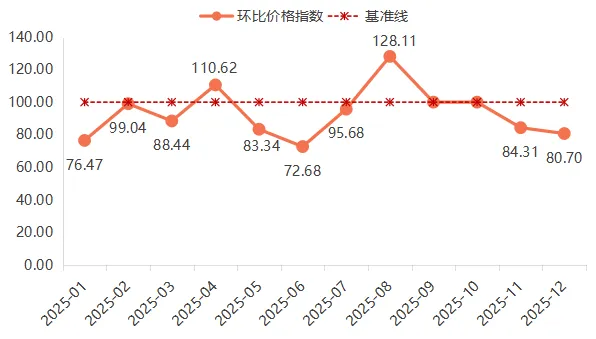 2025年1-12月,山竹类环比价格指数受季节供应节奏、短期需求波动影响,呈现“震荡下行与阶段性上涨交替”的特征,全年指数以跌为主,区间在72.68-128.11点之间,其中6月环比跌幅最大,8月环比涨幅最大。
