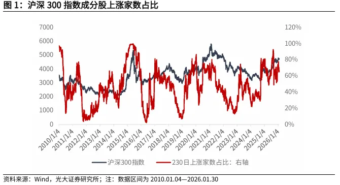 市场情绪追踪:截至2026年1月30日,沪深300指数上涨家数占比指标最近一个月环比上月小幅下降,上涨家数占比指标高于60%,市场情绪较高。从动量情绪指标走势来看,近一月快线慢线同步向上,快线处于慢线上方,预计在未来一段时间内将维持看多观点;从均线情绪指标来看,短期内沪深300指数处于情绪景气区间。