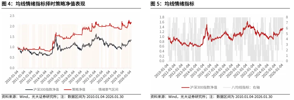 截至2026年1月30日,从均线情绪指标来看,短期内沪深300指数处于情绪景气区间。