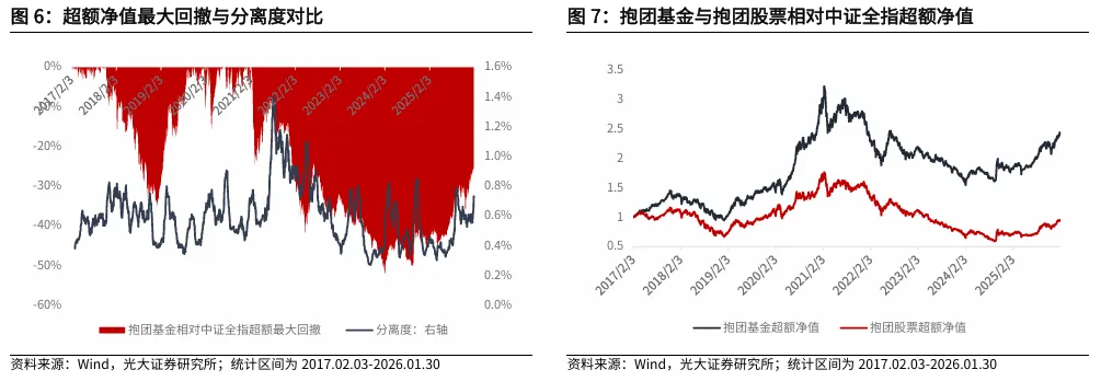 基金分离度跟踪:截至2026年1月30日,基金抱团分离度小幅上行,基金抱团程度有所减弱。最近一月抱团股和抱团基金超额收益均上行。