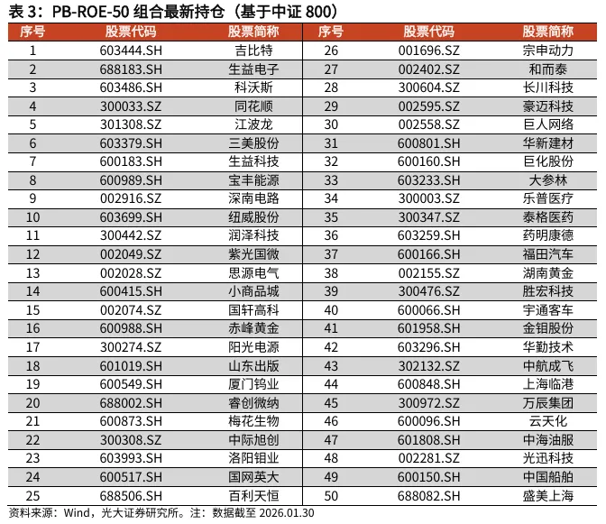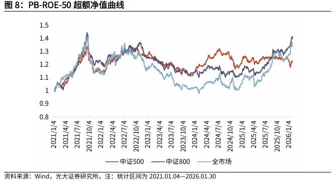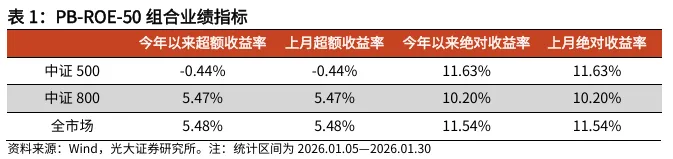 PB-ROE-50策略跟踪:2026年1月,PB-ROE-50策略在中证800和全市场股票池取得正超额收益。基于中证500股票池获得超额收益-0.44%。基于中证800股票池获得超额收益5.47%。基于全市场股票池获得超额收益5.48%。