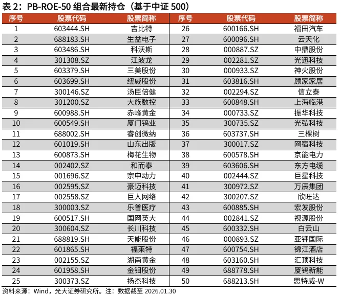 PB-ROE策略的核心思想是寻找市场中的预期差,同时叠加超预期因子增强组合收益。我们以Wilcox(1984)推导出的PB-ROE定价模型为基础得到预期差股票池,并选择SUE、ROE同比增长等因子精选50只股票构造出PB-ROE-50组合。2026年1月,PB-ROE-50 策略在中证800和全市场股票池取得正超额收益。基于中证500股票池获得超额收益-0.44%。基于中证800股票池获得超额收益5.47%。基于全市场股票池获得超额收益5.48%。
