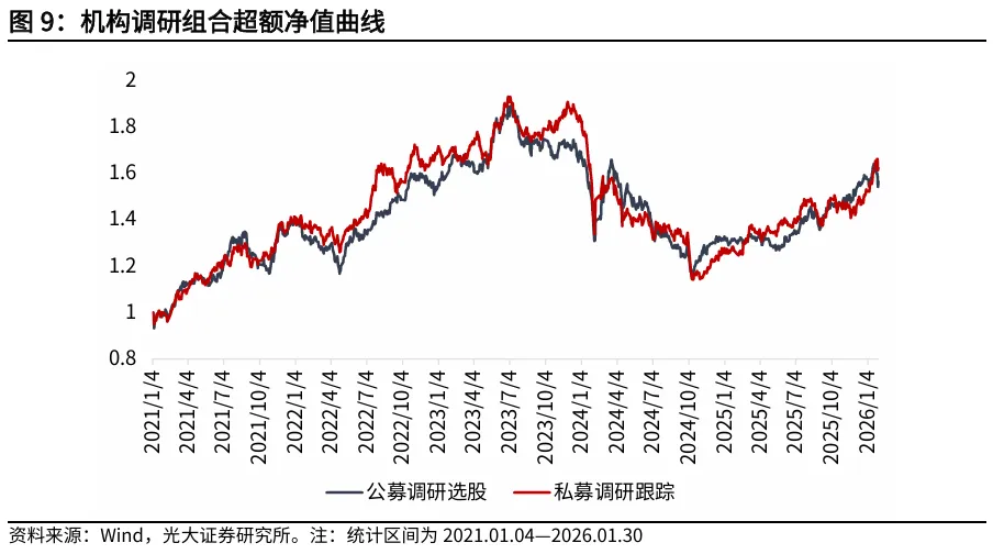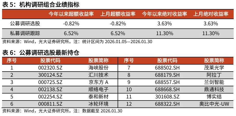 机构调研策略跟踪:2026年1月,私募调研跟踪策略获取正超额收益。公募调研选股策略相对中证800获取超额收益-0.82%,私募调研跟踪策略相对中证800获取超额收益6.52%。