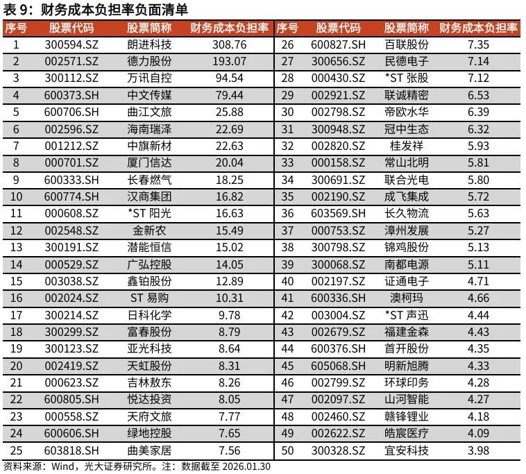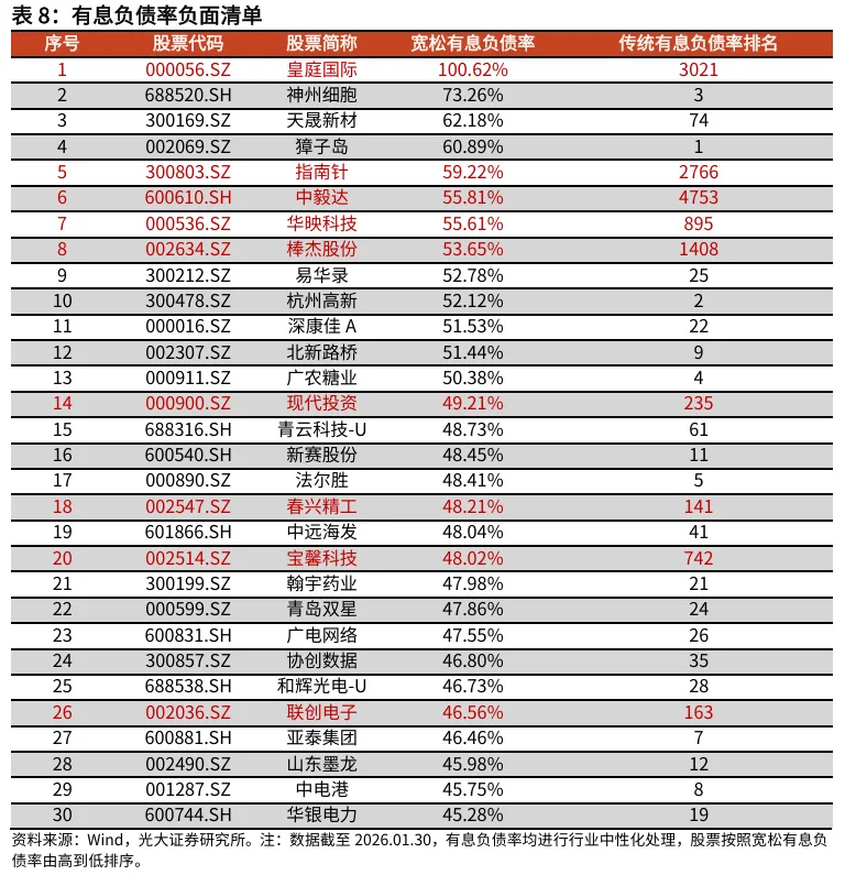负面清单:截至2026年1月30日,宽松有息负债率排名前30的股票中,皇庭国际、指南针、中毅达、华映科技、棒杰股份、现代投资、春兴精工、宝馨科技、联创电子在传统口径下排名在100及以后。