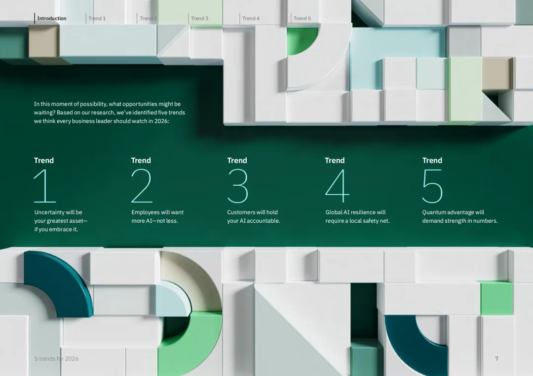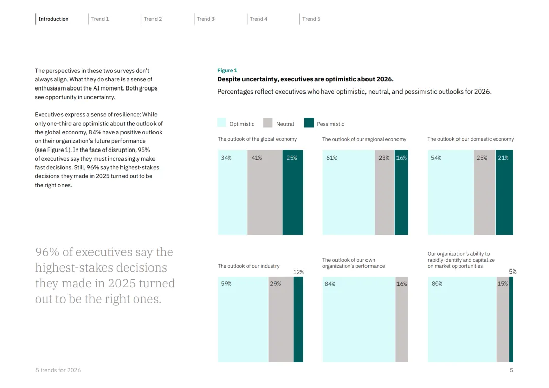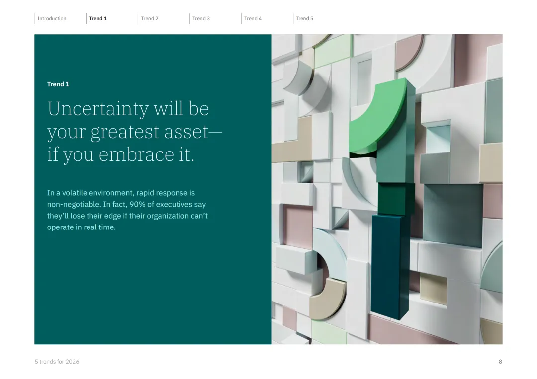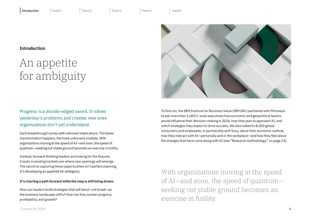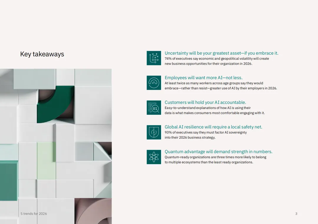 IBM 商业价值研究院联合 Phronesis 与 Suzy 开展专项调研,涵盖 1028 位企业高管及 8500 名全球消费者与员工,精准预判 2026 年商业领域五大核心趋势,为企业在不确定性中把握机遇提供战略指引。