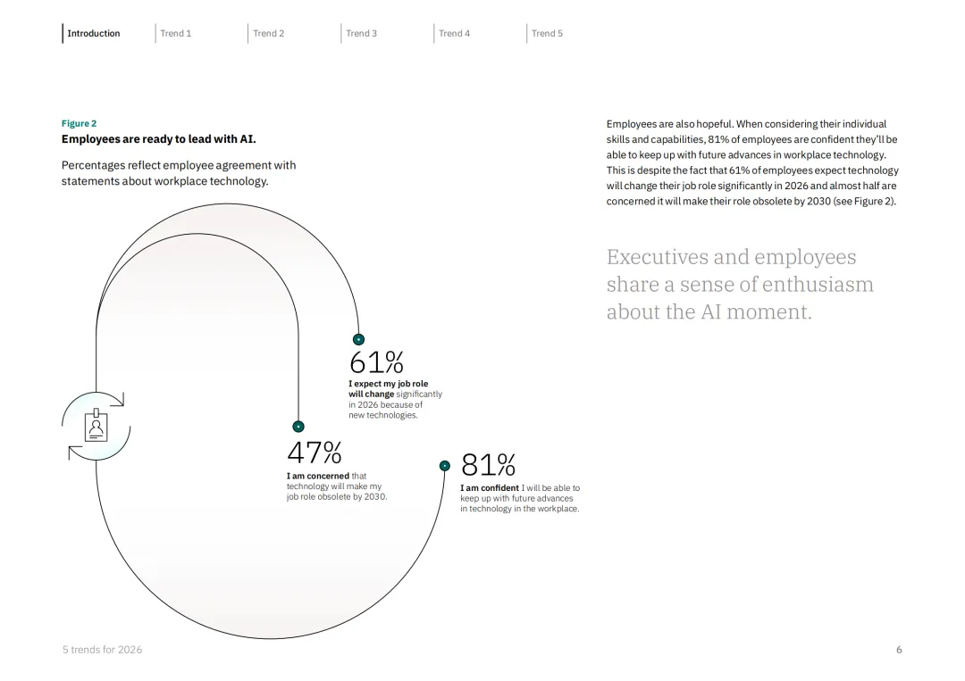 趋势二:员工渴求更多 AI 赋能。各年龄段员工对 AI 的接受度远超高管预期,至少两倍于抗拒者的员工愿意拥抱职场 AI 深化应用。AI 已显著改善工作体验,61% 的员工认为 AI 减少了重复性工作、提升了工作战略性,48% 愿意接受 AI 管理,56% 为获取 AI 培训甚至考虑换工作或降薪。高管与员工共识在于技能重塑,问题解决与创新能力将成为 AI 时代核心竞争力。