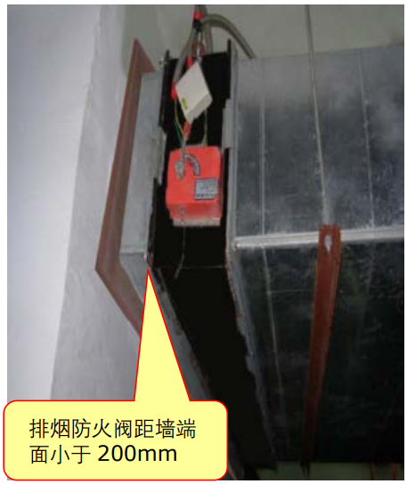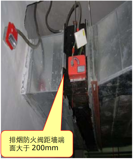 排烟风管穿越防火墙、防火隔墙处设置的排烟防火阀穿越墙体处,与墙面的距离大于200mm。