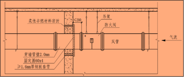 2.通风管、空调风管穿越防火墙、防火隔墙处设置的防火阀穿越墙体处,与墙面的距离均不应大于200mm。