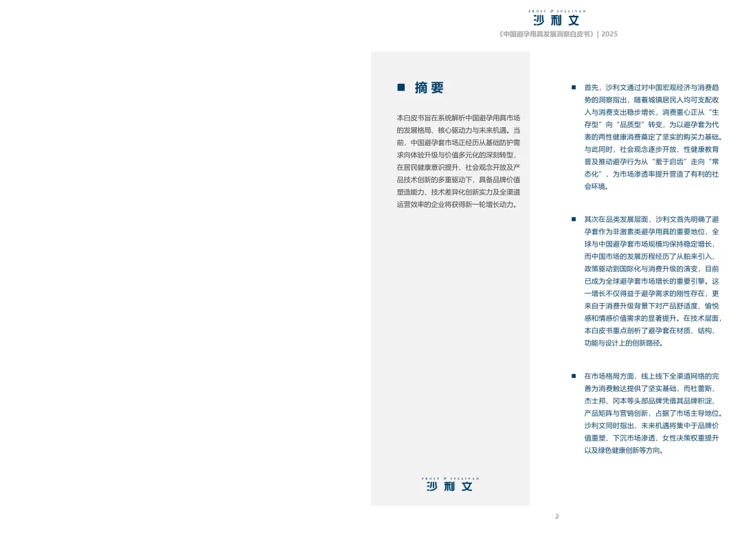 避孕套作为非激素类避孕工具,在全球与中国市场均保持稳定增长态势,其发展路径经历了从引入、政策驱动到消费升级的演变。产品在材质、结构、功能及设计方面不断创新,以满足消费者对舒适度、愉悦感和情感价值的需求。市场格局呈现头部品牌主导、线上线下渠道完善的特点,未来增长点将聚焦于品牌价值重塑、下沉市场渗透、女性决策权提升及绿色健康创新等方面。