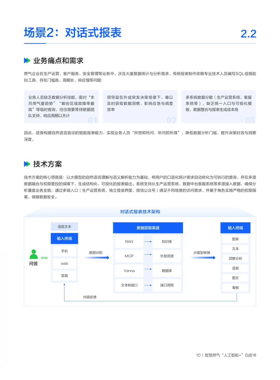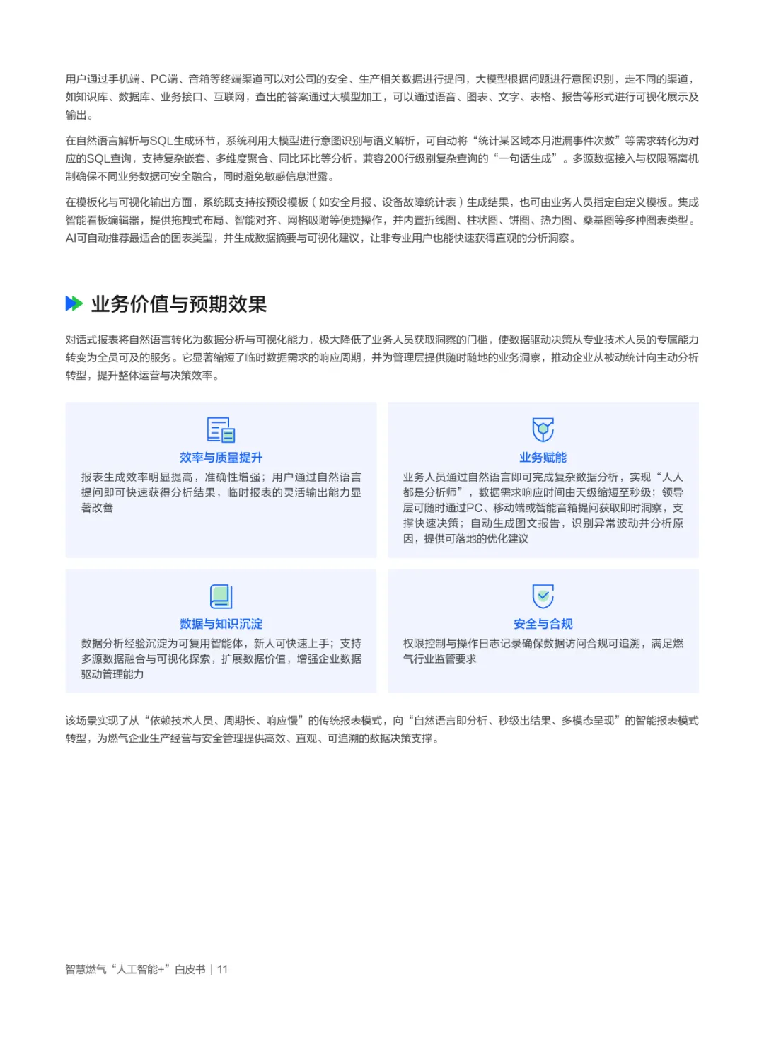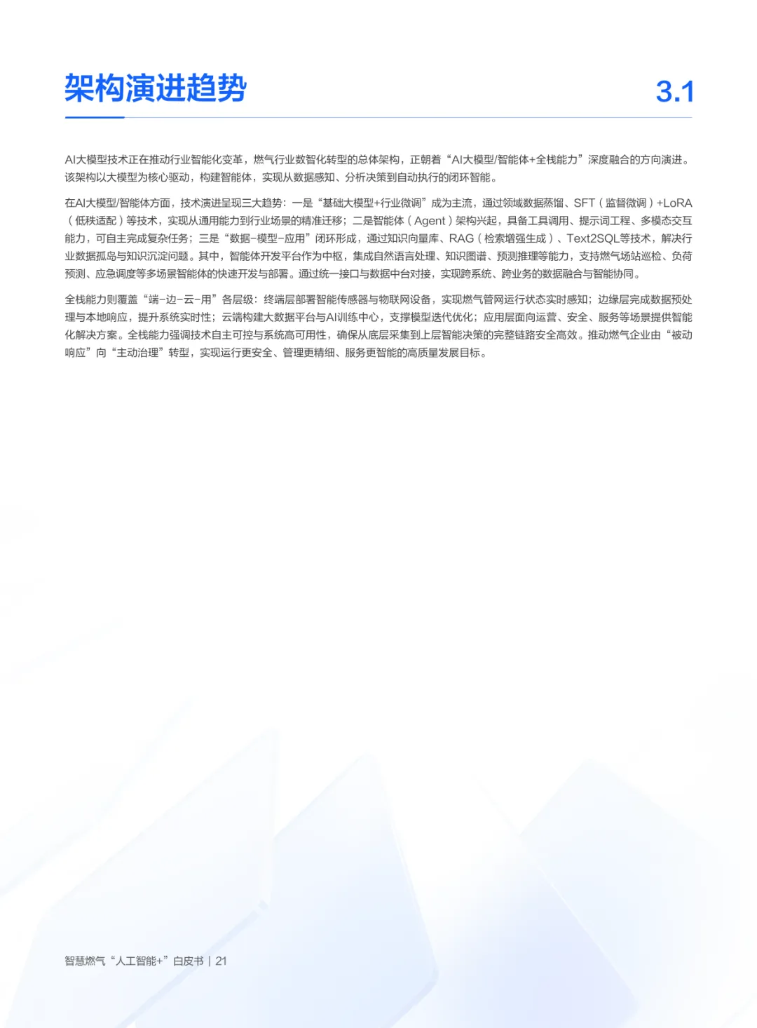 白皮书首先剖析政策与行业背景:国家将大模型定位为赋能新型工业化的重要抓手,能源领域明确AI是智慧燃气建设的核心支撑,“十五五”规划强调生成式AI向能源渗透,推动多能协同与安全范式变革;燃气行业因天然气在低碳过渡中的重要角色,亟需AI破解安全生产(风险预警滞后)、智能运维(人工巡检局限)、客户服务(响应低效)、供需匹配(信息孤岛)等瓶颈,企业转型诉求集中于安全防控、服务优化、供需匹配与统一管理四大领域。