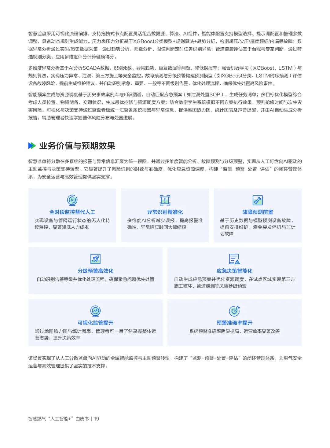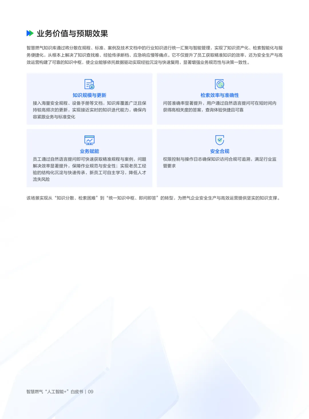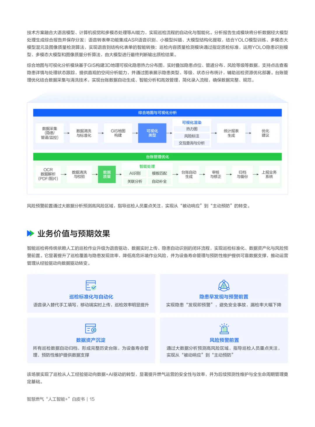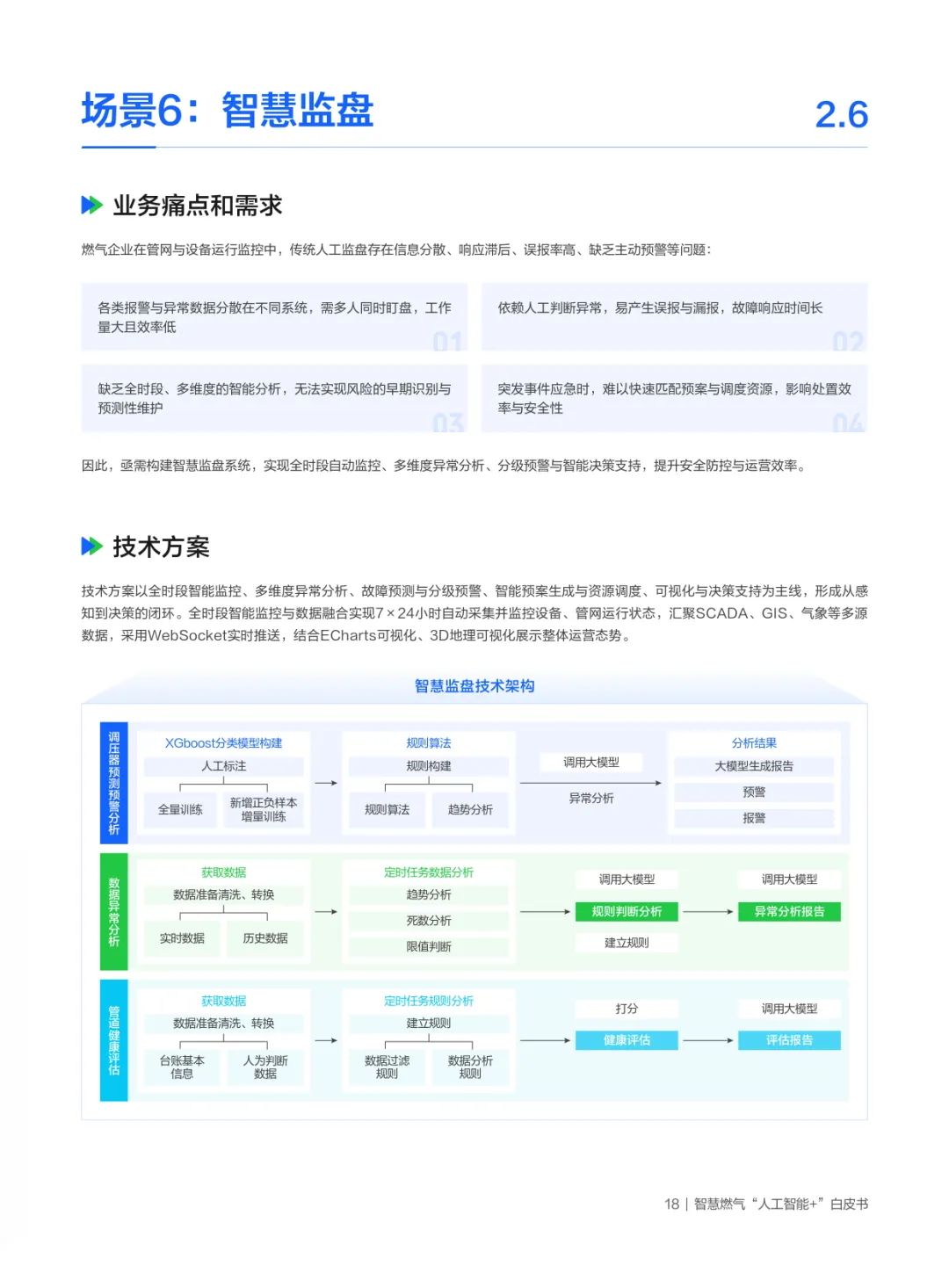 白皮书首先剖析政策与行业背景:国家将大模型定位为赋能新型工业化的重要抓手,能源领域明确AI是智慧燃气建设的核心支撑,“十五五”规划强调生成式AI向能源渗透,推动多能协同与安全范式变革;燃气行业因天然气在低碳过渡中的重要角色,亟需AI破解安全生产(风险预警滞后)、智能运维(人工巡检局限)、客户服务(响应低效)、供需匹配(信息孤岛)等瓶颈,企业转型诉求集中于安全防控、服务优化、供需匹配与统一管理四大领域。