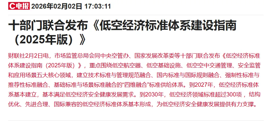 了解到,市场监管总局会同中央空管办、国家发展改革委等十部门联合发布《低空经济标准体系建设指南(2025年版)》,重点围绕低空航空器、低空基础设施、低空空中交通管理、安全监管和应用场景五大核心领域,建立技术标准与管理规范融合、国内标准与国际规则融合、强制性标准与推荐性标准融合、基础标准与场景标准融合的“四维融合”标准供给体系。