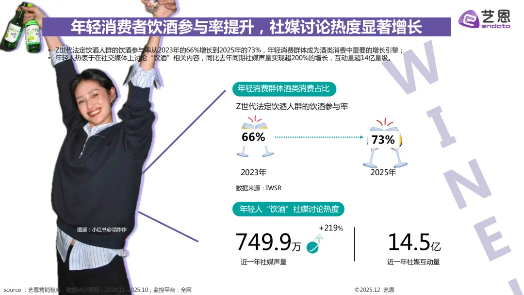 2023到2025年,Z世代法定饮酒人群的参与率持续走高,已然成为酒类消费市场的核心增长引擎,年轻人对饮酒的讨论在社交平台上热度爆棚,微醺成为大家的核心饮酒需求。喝酒的核心诉求转向情绪价值的获取,啤酒是消费基础,气泡酒、鸡尾酒这类低度潮饮涨势迅猛,白酒品牌也靠年轻化玩法打入年轻市场。个人小酌、聚会、商务宴请是三大核心饮酒场景,朋克养生、DIY调酒成新风尚,低度酒市场规模持续扩容,传统白酒巨头也纷纷下场布局,争抢年轻消费群体。