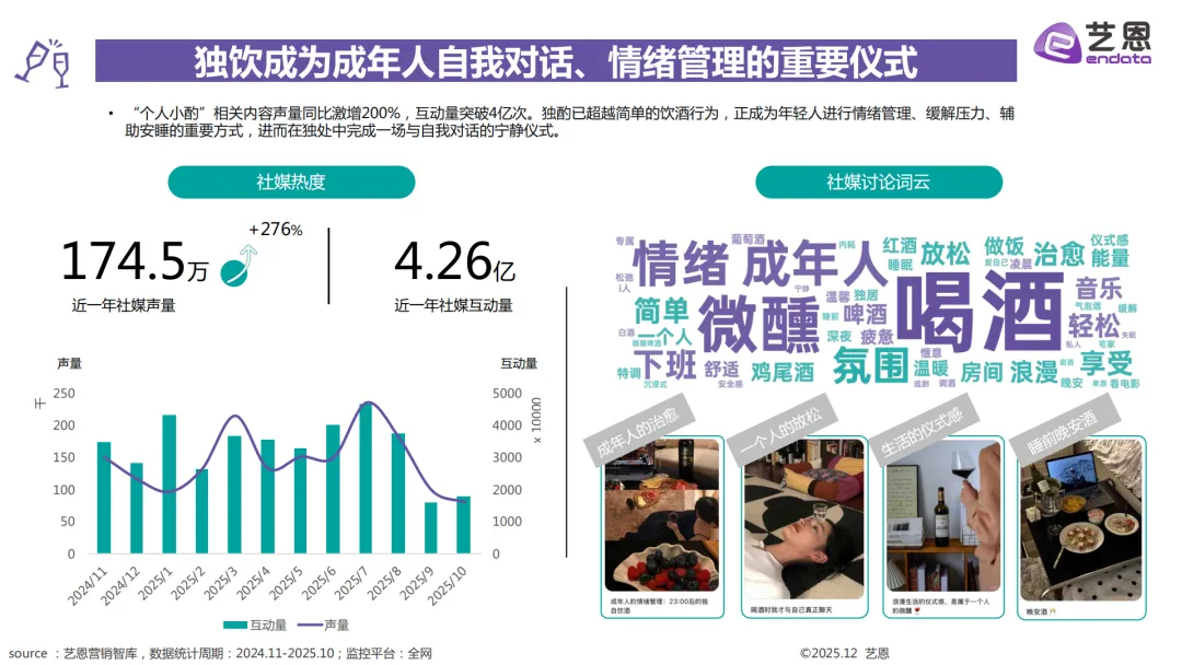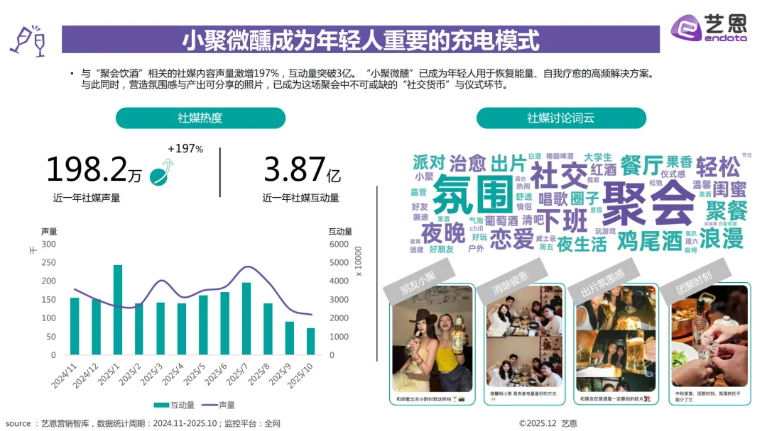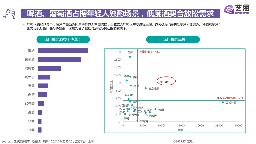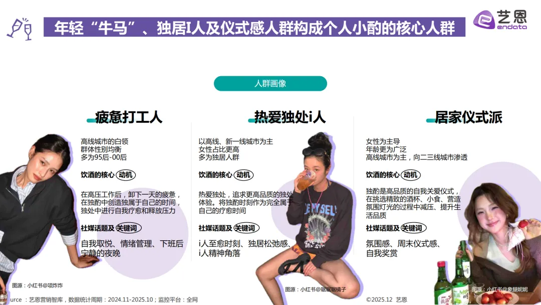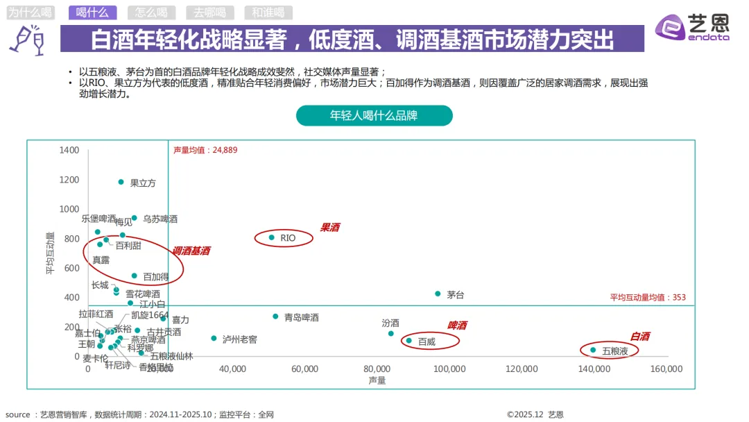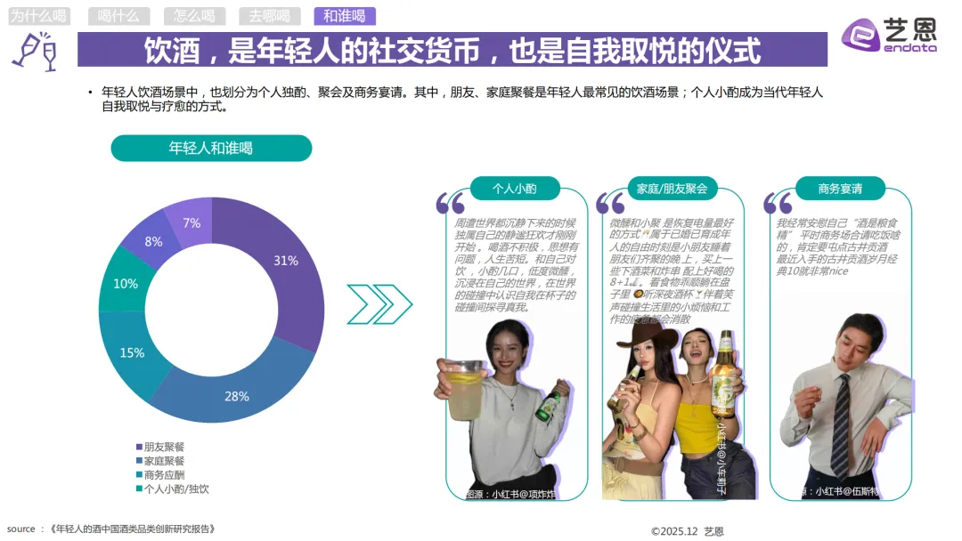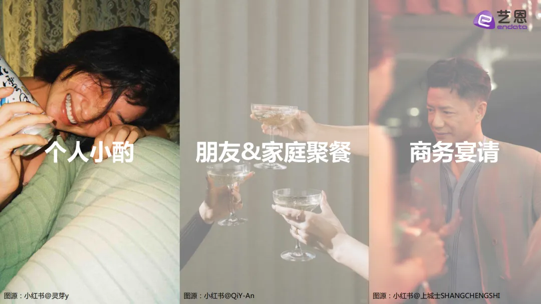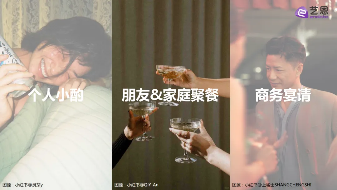 个人小酌的主力是高线城市的95后到00后打工人,还有独居的I人和爱搞居家仪式感的女性,常喝的是啤酒、葡萄酒和RIO这类低度酒,也是互动量最高的饮酒场景。朋友和家庭聚餐的人群覆盖广,从18-28岁的白领、大学生到26-34岁的已婚人群都有,啤酒是基础,也会喝梅见、真露这类低度酒,偶尔也会选茅台。商务宴请以22-26岁的职场新人、28-34岁的资深商务男性为主,茅台是首选白酒,葡萄酒、威士忌也很受欢迎,这个场景的社媒声量增长也是最快的。