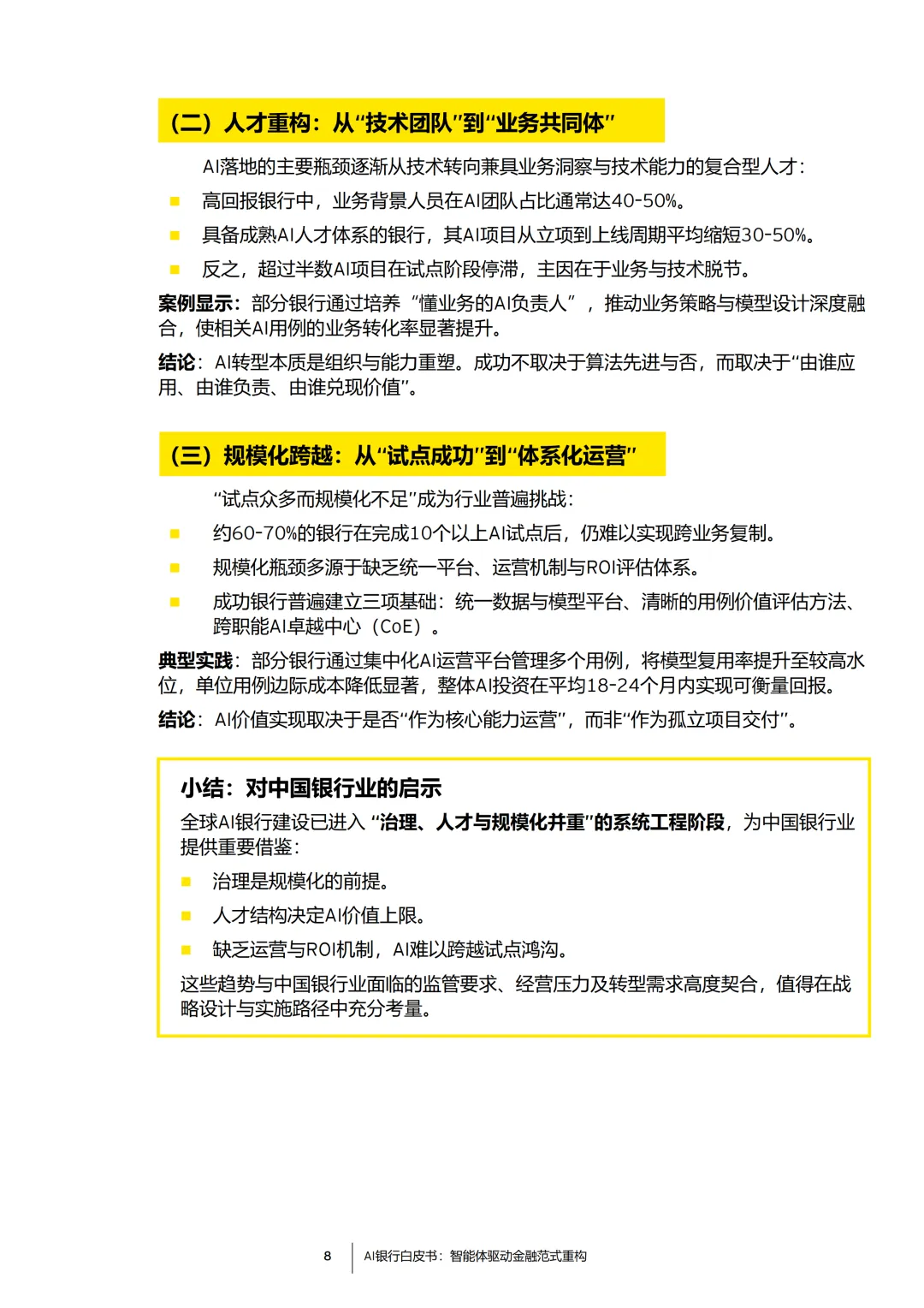 人才重构:高回报银行的AI团队中业务背景人员占比达40%-50%,凸显业务与技术深度融合的必要性;