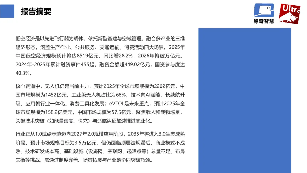 这份由鲸奇智慧与即智Ultra联合发布的《2025年低空经济发展趋势报告》,全景式地剖析了中国低空经济从概念走向实践的关键转折期。其核心洞察在于:2025年是中国低空经济1.0阶段的"动荡调整年",产业正从"试点示范"向"规模应用"艰难过渡,核心矛盾已从"有无问题"转向"好用问题"。以下是对报告核心内容的深度解读:报告将低空经济界定为以先进飞行器为载体、依托新型基建与空域管理、融合多产业的三维经济形态,核心活动空域在1000米以下(部分场景可扩展至3000米)。这一概念在中国经历了从2010年首次提出,到2021年纳入国家规划,2023年明确为"战略性新兴产业",再到2025年"十五五"规划建议将其列为新兴支柱产业的跃迁,标志着其已成为国家经济战略的核心组成部分。- 生产作业(农业植保、巡检测绘):以降本增效为核心,已形成专业服务市场- 公共服务(应急救援、城市治理):具备政府刚需特征,但复购率较低- 交通运输(载人交通、物流运输):本质是拓展物理空间,重构三维经济- 消费活动(编队表演、商业航拍):娱乐驱动,商业模式灵活多样中国低空经济正处于爆发式增长通道,但增速逐步放缓。预计2025年市场规模达8591亿元,同比增长28.2%;2026年将突破万亿元大关至10644.6亿元。这一增速相较于2021-2024年的超高速扩张已明显回落,印证了"动荡调整期"的判断。- 规模:2025年中国民用无人机市场规模预计达1452亿元,占全球(2202亿元)的66%,其中工业级无人机占比68%,消费级占32%- 增长驱动:行业级应用快速下沉县域市场,农业植保、测绘巡检等场景规模化复制- 核心特征:完成从"娱乐工具"到"行业效率利器"的转型,AI赋能、长航时固态电池、集群协同成为技术主战场- 规模:2025年中国eVTOL市场规模57.5亿元,全球约158.2亿美元,仍处于极早期阶段- 发展态势:全球超过800家企业入局,2022-2024年全球销量从30架增至130架,年均复合增长率达51%- 关键瓶颈:适航认证是最大"拦路虎",亿航EH216-S虽于2025年"四证齐全",但全行业实际交付能力严重不足报告将2025年定义为低空经济1.0阶段的收官之年,这一判断基于三个关键信号:产业发展正从 "政策驱动"向"市场驱动"深刻转型 。早期依靠补贴和政策红利的粗放增长模式难以为继,各地政府设立的产业基金(如合肥产投2025年投资7次列全国第一)虽仍活跃,但资本更加关注商业模式的可持续性。2025年Q3融资总额达100.81亿元同比增长77%,但"虚火旺"现象明显,大量项目仍依赖政府输血。产业主要矛盾从 "有无问题"转向"好用问题" 。无人机等硬件已实现从0到1的突破,但面临三大可用性障碍:- 基础设施"四张网"(设施网、空联网、航路网、服务网)建设不足,全国通用机场仅487个,5G-A网络覆盖虽达300多个城市,但起降点等物理设施"总量不足、布局失衡"- 空域管理僵化,D/E类管制空域审批复杂,G/W类非管制空域电子围栏、网格编码等数字化管理手段尚未普及- 商业模式单一,多数场景(尤其是公共服务)依赖财政补贴,"卖设备"仍是主流,"飞行即服务(FaaS)"等订阅模式刚起步- 无人机领域:中国已形成全球最优量产成本,大疆等企业在消费级市场占据主导,工业级应用渗透加速,发明专利申请量从2015年的1501件激增至2024年的17191件,技术从"跟跑"转向"领跑"- eVTOL领域:全球仍处技术验证期,多旋翼(如亿航EH216-S)、复合翼(如峰飞V2000CG)、倾转旋翼三大技术路线并行,能量密度、快充、飞控系统等关键技术尚未突破,适航标准各国各自为政- 农业植保:市场规模超300亿元,占全球40%,单机作业效率是人工的15-20倍,节水90%、节药30%以上- 巡检测绘:2024年需求量8.01万台,市场规模129.9亿元,AI缺陷识别准确率98%,远超人工20%-30%的漏检率- 物流运输:处于商业化探索初期,城市即时配送时间节省可达80%,成本降低10-40%,但规模化运营受限- 消费级市场:从"爆发式增长"转向"理性消费",商业航拍规模超252亿元,无人机集群表演成为少数盈利稳定的细分赛道人才结构矛盾凸显:2025年底民用无人机操控员执照保有量32.7万本,但企业需要的是能在复杂环境作业的复合型"飞手",简单持照者已饱和,"黑飞"案件同比增长42%背后反映的是人才供需错配。- 适航认证冲刺:亿航EH216-S成为全球首个"四证齐全"机型,峰飞V2000CG成为首架吨级以上"三证齐全"产品,预计2025-2028年将有一批机型集中获证- 订单与交付背离:沃兰特、时的科技等企业刷新单笔订单金额纪录,但实际交付能力严重不足,"大额意向订单"与"产能不足"矛盾突出- 场景聚焦:短期内聚焦 "低空+文旅" (如深圳世界之窗eVTOL体验航线)和 "低空+物流" (如跨海物资运输)两大相对成熟场景,遵循"先载物后载人、先郊后城"的渐进路径- 空域权属不明:军民地三方协同机制不健全,D/E类管制空域审批流程繁琐,G/W类非管制空域缺乏数字化管理手段- 监管体系割裂:民航、公安、军方多头管理,缺乏统一执法细则和跨区域适航互认机制,导致"一城一策"市场割裂- 成熟场景增长缓慢:农业植保、巡检测绘等传统场景增速放缓,公共服务场景复购率低- 成本结构倒挂:eVTOL单机研发和适航认证成本高达数亿美元,运营成本中电池折旧占比超40%,但用户付费意愿未充分激活- 盈利路径模糊:除集群表演等少数赛道外,多数企业仍处于"烧钱换市场"阶段- 核心技术卡脖子:能量密度400Wh/kg以上的固态电池、高可靠飞控系统、智能避障算法等仍待突破- 产业链协同弱:材料、整机、运营、服务环节