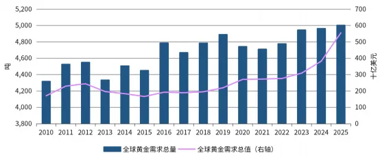 2025年见证了全球黄金需求的激增和金价的大幅飙升。持续的经济和地缘政治风险已成为“新常态”,消费者和投资者纷纷买入并持有黄金。黄金投资需求成为全年焦点,投资者通过各种可用渠道争相配置黄金。美元金价较上年同比大涨 67%,但金饰需求仅下降 18%,说明消费者在高金价环境下仍愿意购入金饰产品;同时,全球央行也坚定致力于增加黄金储备。