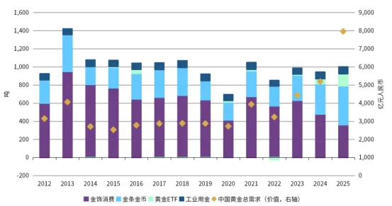 2025年全年黄金需求总量达1003吨,同比增长6%,为2021年以来最高水平。按金额计,全年需求更是创下历史新高,总额达7960亿元人民币,同比激增53%。