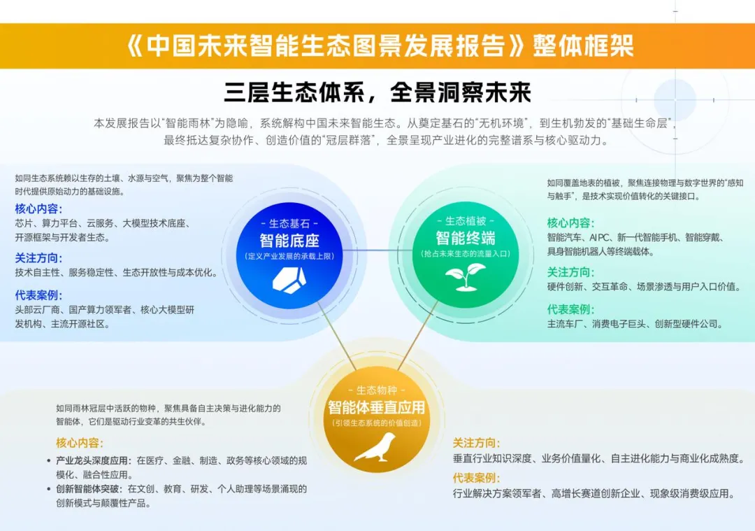 本次报告案例征集,创新性地按“智能体全栈价值链”划分,重点收录三大AI生态象限的前沿创新企业案例,具体范围如下: