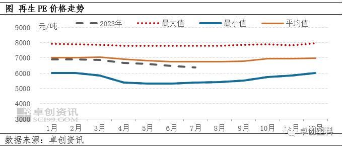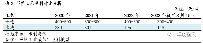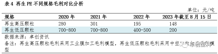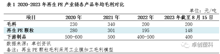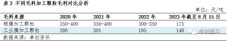 再生PE是使用完毕后报废的PE制品以及在PE制品合成、加工过程中产生的下脚料经过回收利用再加工形成的颗粒状物体。产业链条为废塑料——再生PE颗粒——塑料制品。进入2023年,再生PE价格呈现震荡下滑态势。以河北保定再生高压白透明一级造粒为例,价格维持在近七年平均水平偏低位置,且与平均值价差逐步扩大,由1月份的-1.47%扩大至7月份的-5.54%。截至目前,影响2023年再生PE市场行情的因素主要为供需面。制品厂家订单较去年出现不同程度缩减,部分厂家甚至减少50%以上。需求萎缩对再生PE价格形成利空。尽管再生厂家灵活调整生产,但由于持续出货缓慢,现货库存一度居高不下。供需矛盾加深,再生PE价格承压下滑。此外,毛料货紧价高,再生厂家受高成本和弱需求共同影响,加工毛利受到挤压。反过来,受加工毛利微薄影响,再生厂家对高价毛料接受度低,迫使上游打包站让利,同时与下游制品厂家交易过程中,为保证一定盈利,存低价惜售情绪。从纵向或横向来看,再生PE加工盈利能力表现各不相同。下文将会讨论再生PE与上游毛料、下游制品的纵向产业链毛利传导;横向价值链方面,将从再生PE中不同工艺间的毛利、不同毛料来源的颗粒毛利、不同规格的毛利等几个方面展开。毛料回收环节:从数据来看,截至目前,2023年毛利约在200元/吨,与去年持平,较2020年、2021年略减少,降幅不一。今年的毛利低主要与颗粒需求欠佳,颗粒价格下滑有关。2021年由于市场交易活跃度提高,毛利较2020年增加47.83%。2022年尽管毛料货源供应偏紧,但打包站从制品厂家拿货成本较高,而下游颗粒厂处于盈亏线附近,对高价毛料抵触心理较重,因此打包站盈利较2021年减少41.18%,较2020年减少13.04%。从产业链条来看,毛料是前端供应环节,属于话语权相对较重的环节,主要体现在几个方面:1.货源供应结构。2017年以前国内毛料主要依赖进口他国废塑料,2017年“禁废进口”政策实施后,废塑料不允许进口,国内再生厂家的毛料转而寻求国内废弃塑料的支撑,由于回收利用系统不完善,因此初期国内再生厂家的毛料供不应求,尤其是工业废膜利润相对可观。伴随近几年废塑料回收从业人数增多,竞争加剧加之价格逐渐透明,虽然相较下游需求,毛料货源供应维持偏紧态势,但打包站毛利难以涨至高位。2.付款方式。下游颗粒厂在采买废料是均为现款现汇,极少出现欠账交易,从这一点也能看到毛料供应商的地位更“卓然” 。再生PE颗粒加工环节:从数据来看,再生厂家微利运行是常态,截至目前颗粒毛利在148元/吨,较去年减少47元/吨;较2021年减少153元/吨。毛利在2021年处于高点,较2020年增加7.50%,主要原因是需求回温,市场交易活跃度提高,加之新旧料价差拓宽,再生PE颗粒价格上涨。2022年受高成本影响,基本处于盈亏线附近,毛利在195元/吨。2023年,由于需求欠佳,下游采买缩量,再生颗粒持续降价,而毛料降价晚于颗粒,降幅小于颗粒降幅,因此再生颗粒毛利持续萎缩。颗粒厂家处于链条的中间环节,议价能力相对弱势,主要是由于供需关系决定的。再生塑料进入门槛低,货源供应充足,造成颗粒供过于求,从第一部分价格变化的驱动因素中,能看到需求对价格的影响程度较大,因此面对下游制品厂,再生颗粒厂家亦无议价能力,因此无论是面对毛料,还是面对下游制品厂加工难以求得两全之法,现款采买毛料,而与下游厂家交易则现款、欠账交易均有。作为中间环节,颗粒厂家持续处于价值链的洼地。下游制品环节:据卓创资讯不完全数据调研显示,近几年下游制品盈利能力也在不断下滑。截至目前,2023毛利在400元/吨左右,较去年略减少50元/吨,较2020年、2021年分别减少150元/吨、100元/吨。据卓创资讯不完全调研使用再生塑料的下游厂家来看,近90%厂家反馈2023年订单量小幅缩减,部分下游因订单匮乏在上半年一段时间暂停开工,避免成品库存过多累积。数量及利润均呈现缩减情况下,下游厂家对于颗粒价格更敏感,希望通过压缩成本来维持利润。作为产业链条的终端产品,按单拿货、随用随购是下游制品厂家近几年的采买节奏,几无囤积习惯,加之颗粒货源供应充足,因此下游议价能力较大。总结来看:从再生PE价值链条来看,毛料及下游相对占据利润高地,颗粒厂处于洼地,形成了“微笑曲线”,最丰厚的集中在价值链的两端—毛料和下游。从企业经营角度来看,只有不断往价值高的区块移动与定位才能持续发展和永续经营。无论是干造工艺还是水洗工艺,除个别年份外,近几年的颗粒毛利均呈现逐年下滑态势。其中,干造工艺加工毛利高于水洗工艺,但干造工艺对毛料纯度和洁净度要求较高,因此产量受限。从不同毛料来源颗粒的毛利来看,除个别年份外,近几年的颗粒毛利呈现逐年下滑态势,具体来看,多数年份棚膜颗粒毛利较工业膜毛利要略高一些,2023年棚膜颗粒利润较工业膜毛利略降,主要是由于今年棚膜颗粒需求量较往年缩减较多,加之毛料坚挺,降价有限,因此毛利出现下滑。再生PE分为再生高压和再生低压。除个别年份外,近几年的颗粒毛利均呈现一定下滑态势,其中再生低压颗粒毛料高于再生高压颗粒毛利,但二者差距在缩窄。此外,再生低压颗粒毛利波动相对较大。截至8月份,2023年毛利降至200元/吨左右,较近几年高点(2020-2021年)下滑73.33%。再生高压颗粒毛利由于整体维持在较低水平,相对来说波动幅度受限,2023年较近几