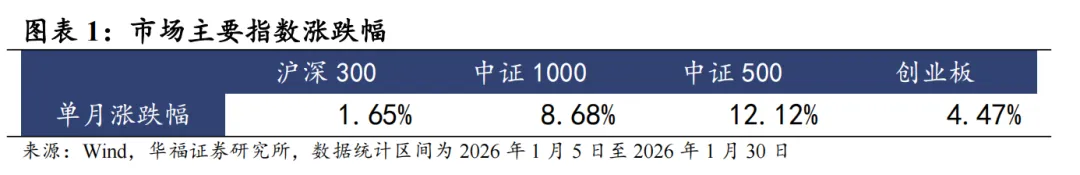 1月整体A股市场上涨。1月沪深300指数收益率为1.65%,中证1000收益率8.68%,中证500收益率12.12%,创业板收益率4.47%。