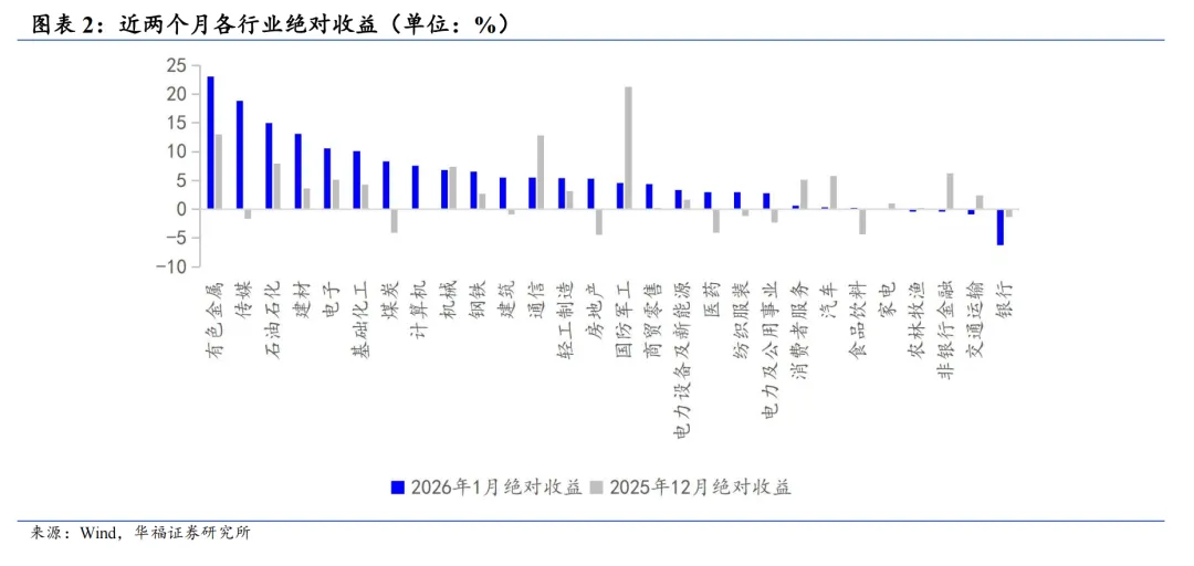1月板块收益涨多跌少,中信一级行业排名前3的行业为有色金属、传媒和石油石化。银行、交通运输、非银行金融等行业下跌。