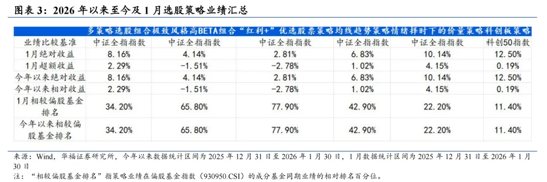 本文合计收录多策略选股组合、极致风格高BETA组合、“红利+”优选股票策略、均线趋势策略、情绪择时下的价量策略和科创板策略合计6个选股策略。1月多策略选股、均线趋势策略、情绪择时下的价量策略和科创板策略较其对应业绩比较基准均创正超额。对比6个选股策略,科创板策略本月绝对收益表现最佳,绝对收益率达到12.50%,情绪择时策略相对于业绩比较基准取得的超额收益最显著,相对中证全指指数取得超过4.15%的超额收益率。科创板策略2026年1月跑进偏股基金指数成份排名的前15%。