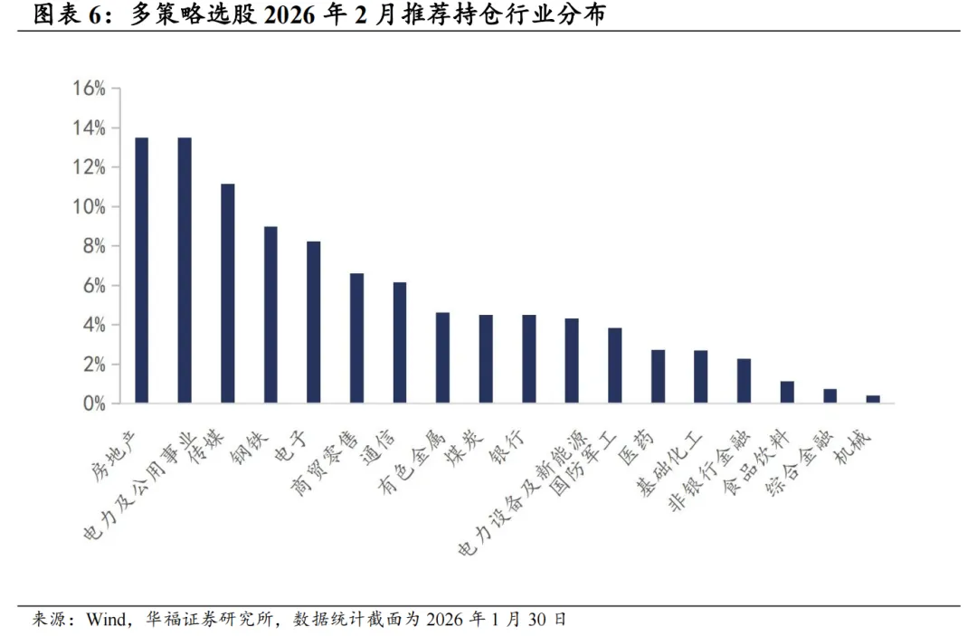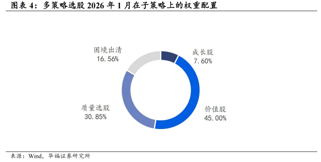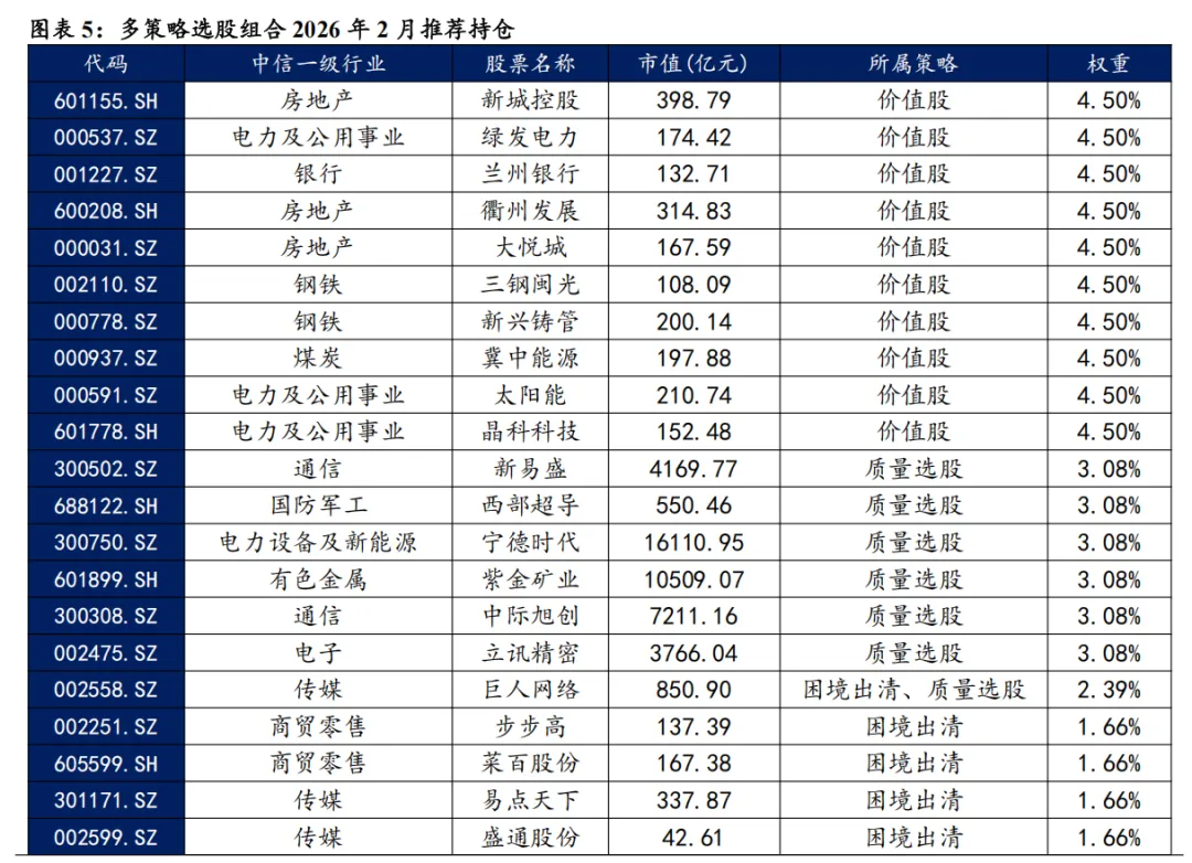 复盘过去十年的A股表现,市场存在明显的风格切换,行情在价值、成长等风格中不断切换。周期角度,风格轮动存在一定的持续性,行情可以维持较长的时间,不同风格间的有效配置可以较为平稳地穿越各类市场环境。其中包含四个子策略,分别为价值股策略、成长股策略、质量选股策略、出清选股策略。四个子策略的驱动要素存在显著区别,各自适应的市场环境差异明显,我们将以上四个子策略进行多策略配置,以传统风险平价以及动量优化的风险平价调整权重,构建股票组合。传统风险平价追求子资产对组合贡献均等的风险,核心要素为子资产的风险指标。动量优化根据策略的波动和动量特征,调整对应风险贡献,提升配置效果。 本文跟踪的多策略选股组合根据子策略过去12个月的风险特征,并以子策略过去80日动量秩排序调整其在多策略选股组合风险贡献度占比,截至2026年1月30日数据显示,策略在2026年2月对子策略的权重配置如下图,在价值股策略权重占比最高,约45.00%,在成长股策略上的权重占比最小,约7.60%。 策略2026年2月推荐组合含股票49只股票。持仓的股票在新城控股、绿发电力、兰州银行、衢州发展、大悦城、三钢闽光、新兴铸管、冀中能源、太阳能、晶科科技等票上权重较高,分别占比4.50%。行业分布上,相对集中于房地产、电力及公用事业和传媒。最新持仓股票平均市值1384.85亿元。策略2月建议持仓单边换手率约为76.46%。
