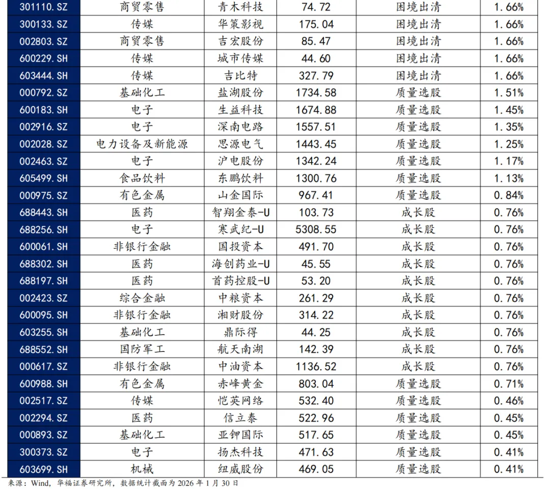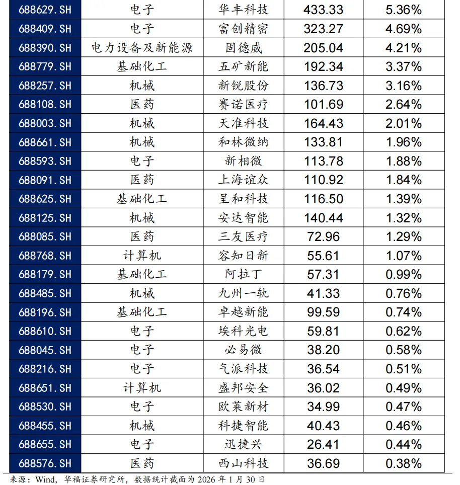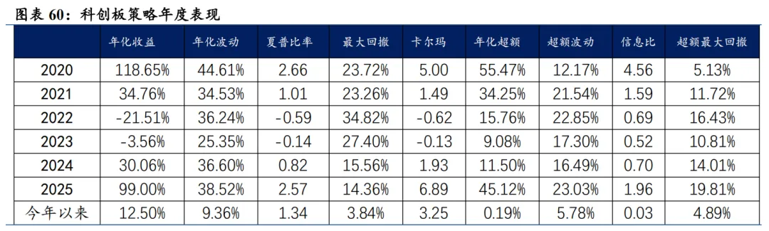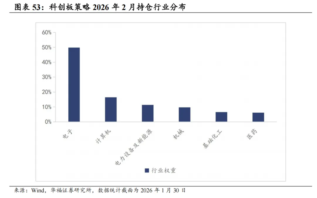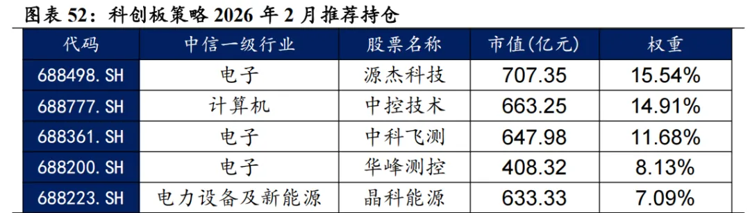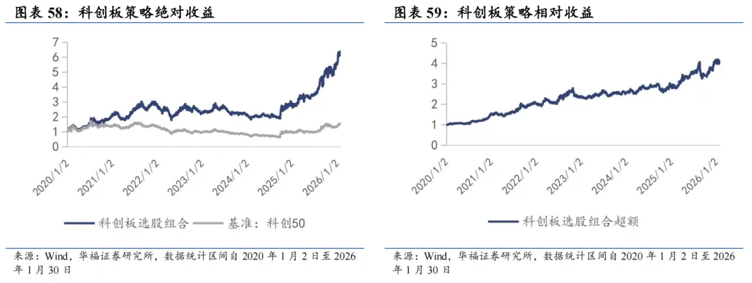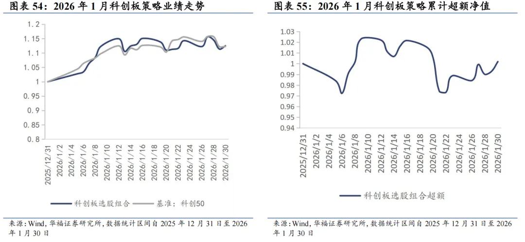 科创板增强思路:1)重预期、重研发:剔除FY1分析师预期因子相对较低的股票2)优选长期分析师预期相对有效的企业;2)现金流、估值:初创企业投入研发对现金流挤压太严重,需要等到现金流有所改善的时期才合适介入,剔除PCF过高企业。3)波动率具有均值回复现象,过高的波动率意味着行情反转换手率和波动率太高(泡沫或恐慌),剔除换手波动最高的股票。4)趋势突破:在趋势向上的股票中寻找波动率放大的股票,这类股票后续上涨的持续性会更高。我们结合以上要点构造了科创板剔除低预期高波动的趋势捕捉策略,该策略在整个科创板内部选股,基准为科创50。截至2026年1月30日数据显示,2026年2月科创增强策略推荐如下表,其中包含30只股票。最新持仓股票平均市值195.61亿元,中信一级行业在电子上集中,占49.90%。其次是计算机,占16.47%。 2026年1月,科创板策略组合绝对收益12.50%,相对科创50指数超额收益0.19%。2026年以来截至1月30日,科创板策略组合绝对收益12.50%,相对科创50指数超额收益0.19%。从组合各风格暴露均值与风格因子收益上看,2026年1月持仓股票在市值、中市值、Beta、动量、流动性和杠杆的风格暴露上取得了正向收益。2026年1月持仓在Beta、流动性、中市值、动量、波动率上呈正向暴露,而在估值、盈利、成长、杠杆和市值上呈负向暴露。2026年2月份最新持仓与2026年1月因子暴露情况存在差异,相对于2026年1月份在Beta、流动性、中市值、动量和波动率的正向暴露有所收敛。在估值、盈利、成长、杠杆和市值的负向暴露有所收窄。 科创板策略相对科创50超额收益显著,各年度超额表现相对稳定。从年化收益表现上看,科创板增强策略取得不错的收益表现,2020年1月2日至2026年1月30日策略组合年化收益36.18%;相对于科创50自2020年1月2日至2026年1月30日组合年化超额收益27.00%,信息比为1.40。08