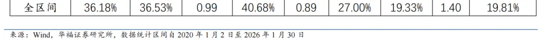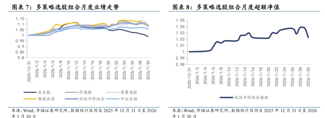 本报告针对多策略选股策略月度业绩统计区间为2025年12月31日至2026年1月30日。2026年1月多策略选股策略绝对收益8.16%,多策略选股策略相对中证全指超额收益2.29%。