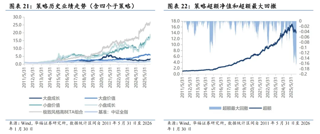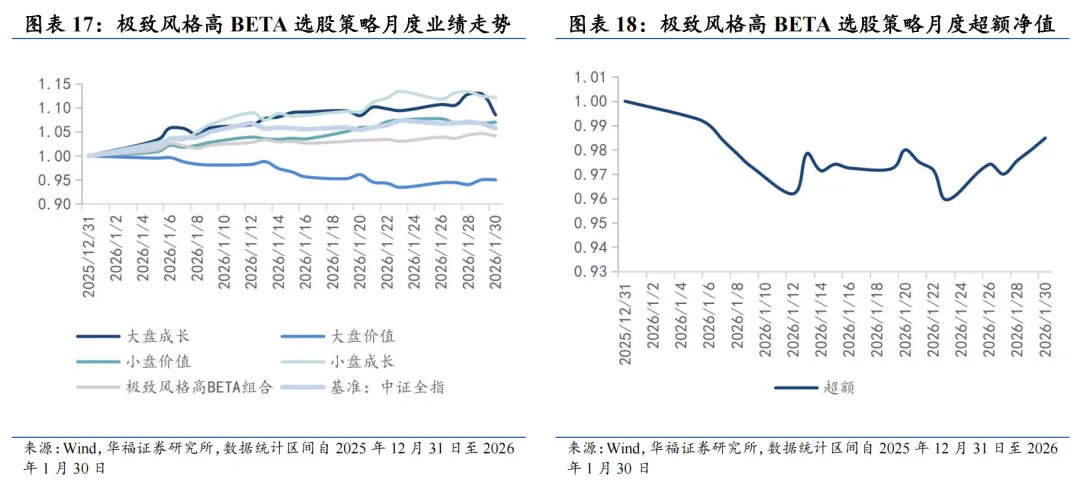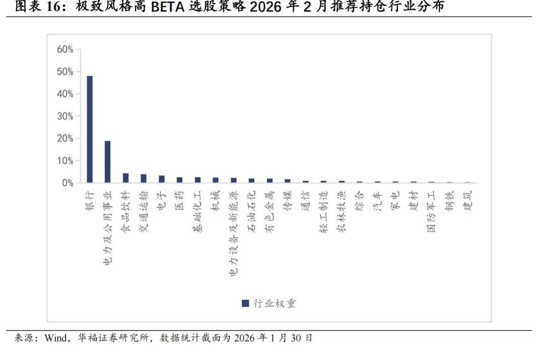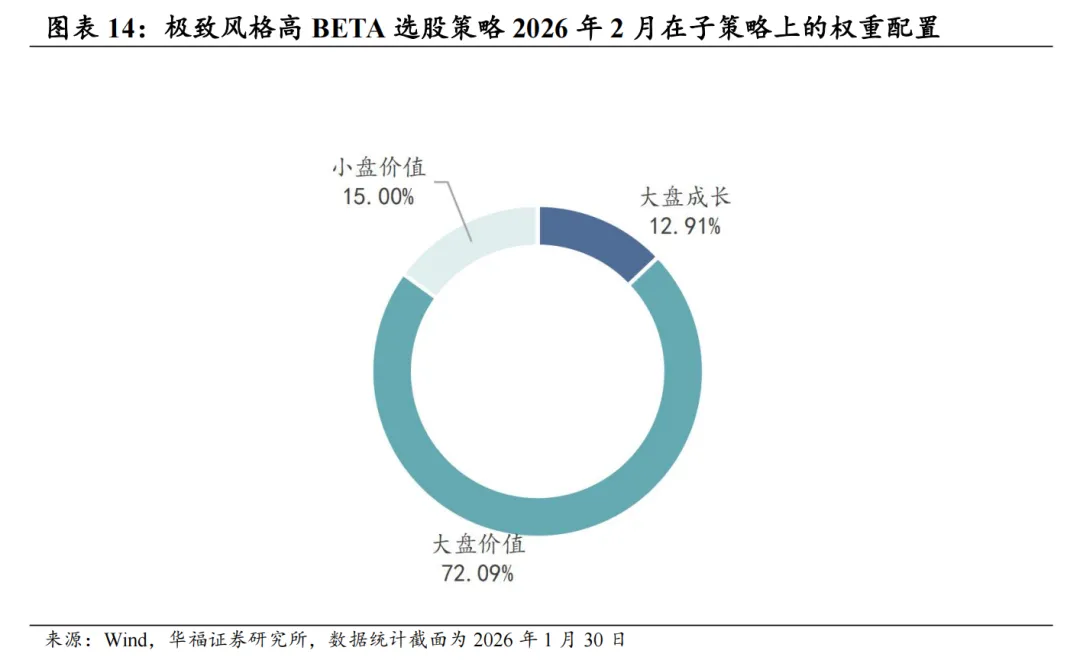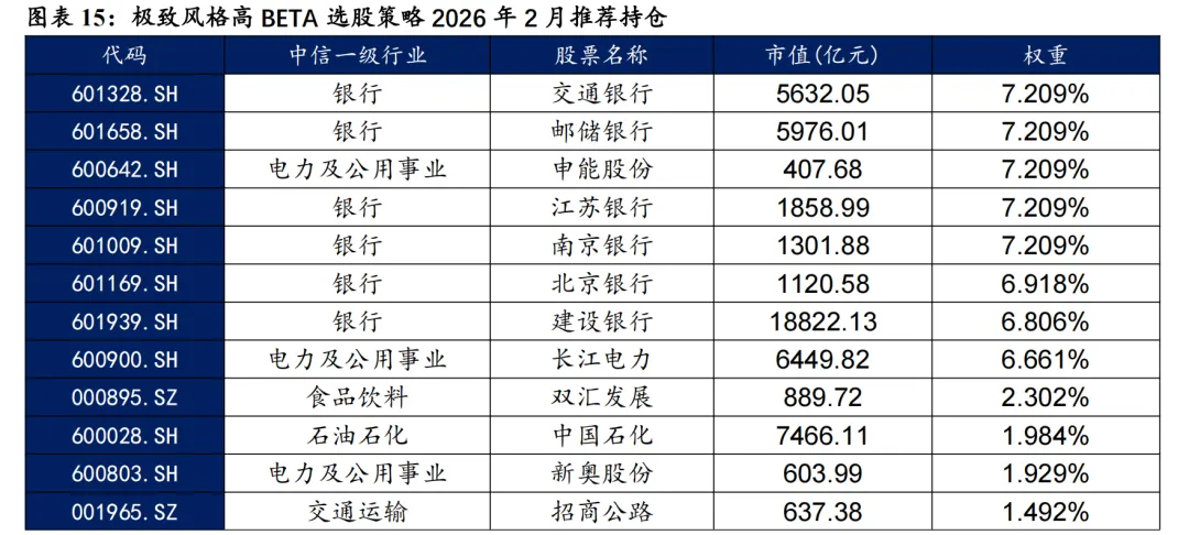基于量价和基本面因子分组单调性判断的选股能力强弱、因子有效性(IC、ICIR)排序,筛选单一风格的强势特指因子,并针对不同风格象限,分别构建单一风格增强策略。 对于大盘价值,我们采用低换手低波动高股息策略。在大盘价值股票基础池中,剔除截面上盈利质量排名靠后的个股,剩余个股用波动率、换手和高股息等因子进行排序优选,构建低换手低波动高股息策略。 对于大盘成长,我们采用剔除高波动的盈利预期平衡策略。在大盘成长股票基础池中,剔除截面上波动率、换手率排名靠前的个股,剩余个股用盈利质量、预期净利润相关因子进行排序优选,构建剔除高波动的盈利预期平衡策略。 对于小盘价值,我们采用剔除低盈利的低波反转增强策略。在小盘价值股票基础池中,剔除截面上盈利、预期增速排名靠后的个股,剩余个股用低波动、反转、小市值因子进行排序优选,构建剔除低盈利的低波反转增强策略。 对于小盘成长,我们采用低盈利高预期组合策略。在小盘成长股票基础池中,剔除截面上短期反转排名后30%的个股,剩余个股用预期净利润增长年率、一致性修正因子和月换手率因子优选,构建低盈利高预期组合策略。 本文跟踪的极致风格高BETA选股策略根据子策略过去12个月的风险特征,并以子策略过去80日动量秩排序调整其在极致风格高BETA选股策略占比,截至2026年1月30日数据显示,策略在2026年2月对子策略的权重配置如下图,在大盘价值策略权重占比最高,为72.09%,在大盘成长策略上的权重占比最小,为12.91%。 策略2026年2月推荐组合含股票90只股票。持仓的股票在交通银行、邮储银行、申能股份、江苏银行和南京银行等股票上相对集中,占比均为7.209%。行业分布上,相对集中于银行。最新持仓股票平均市值2021.82亿元。 本报告针对极致风格高Beta策略月度业绩统计区间为2025年12月31日至2026年1月30日。1月极致风格高Beta策略绝对收益4.14%,极致风格高Beta策略相对中证全指超额收益-1.51%。 从极致风格高BETA选股策略持仓的各风格暴露均值与风格因子收益上看,1月持仓股票在波动率、流动性、盈利、杠杆和市值因子上获得正收益。1月的持仓在估值、盈利、成长、杠杆和市值上呈正向暴露,而在Beta、流动性、动量、波动率和中市值因子上呈负向暴露。 2026年2月份最新持仓的因子暴露情况相比2026年1月存在一定变动,2月在成长因子暴露由正转负;估值、盈利、杠杆和市值因子正向暴露有所放大;Beta、流动性和中市值负向暴露有所放大;动量和波动率负向暴露有所收窄。 极致风格高BETA组合相对中证全指指数超额收益显著,各年度超额表现相对稳定。从年化收益表现上看,策略取得不错的收益表现,相对于中证全指指数自2011年5月31日至2026年1月30日年化超额收益20.54%,信息比为2.21。04