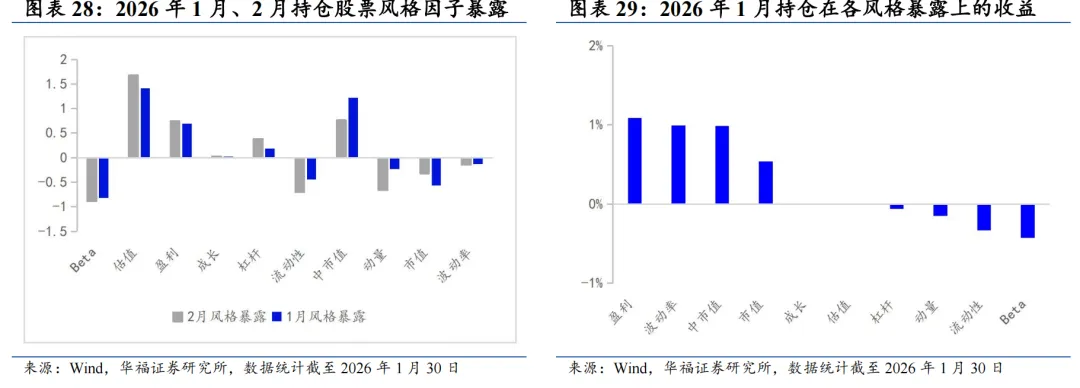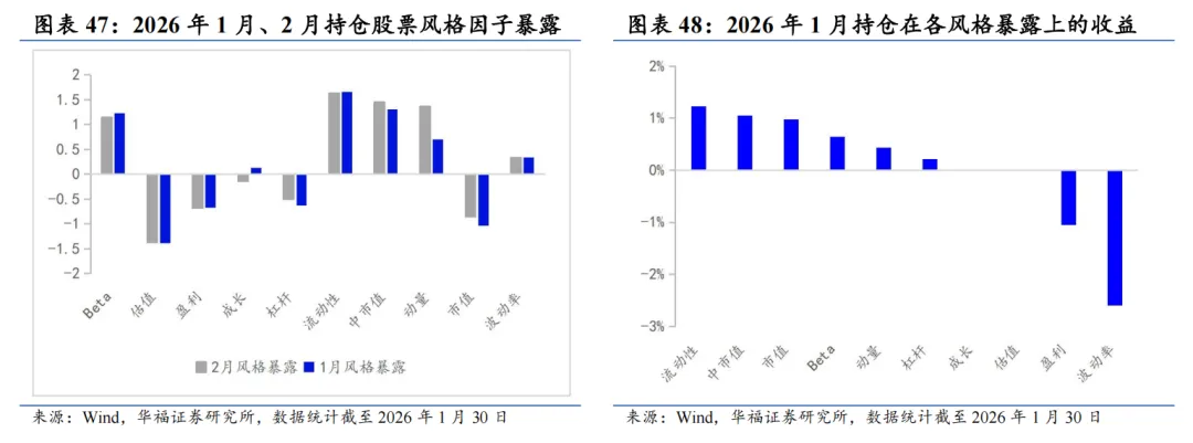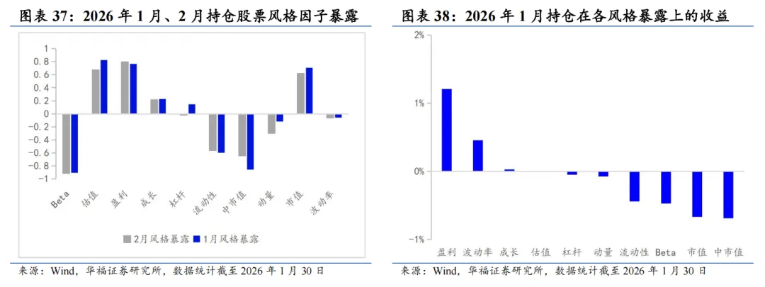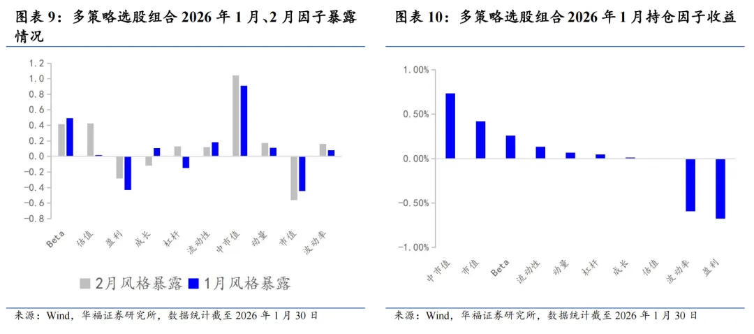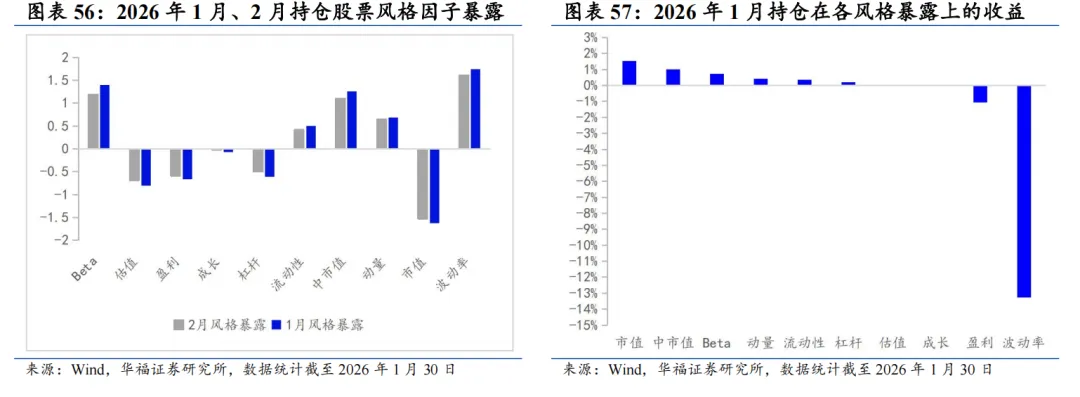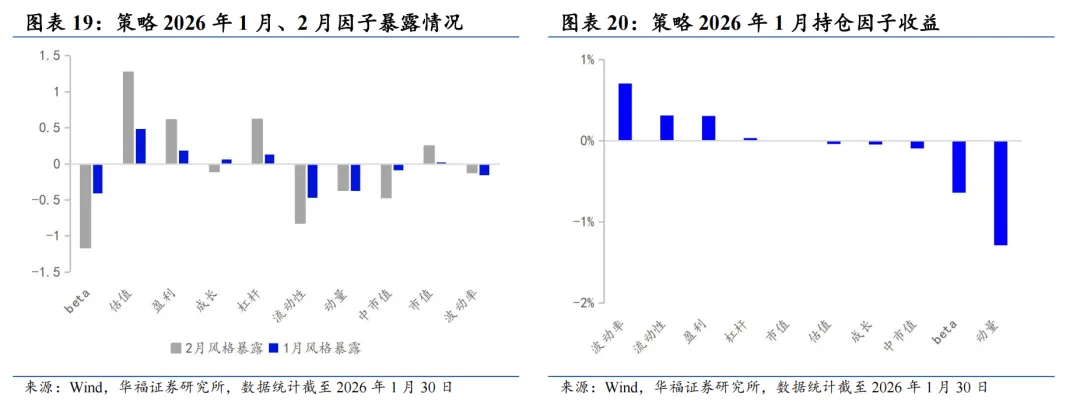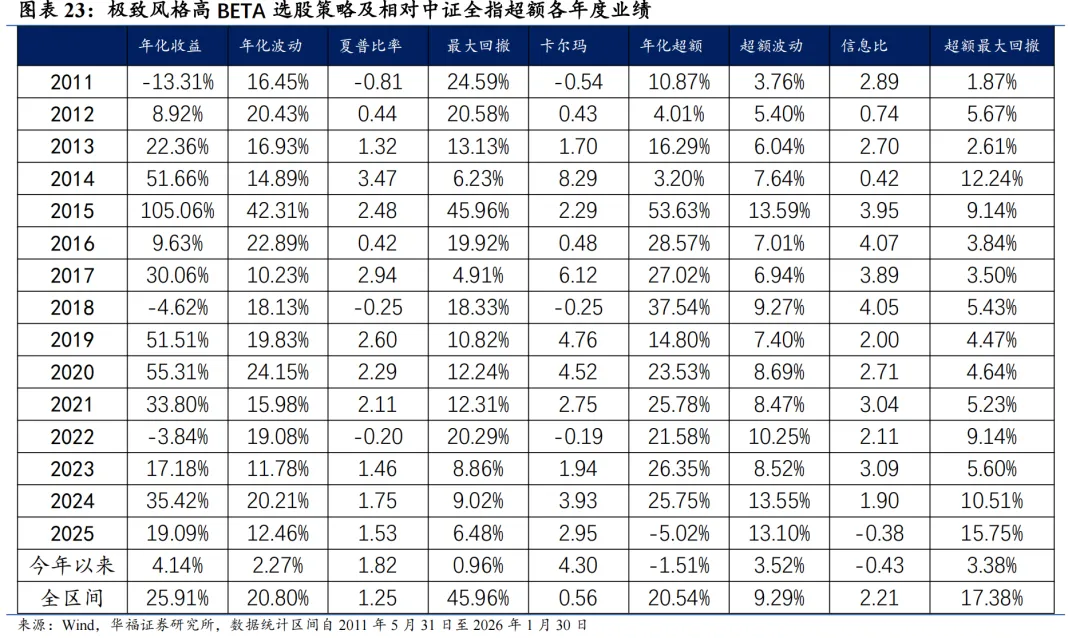 基于量价和基本面因子分组单调性判断的选股能力强弱、因子有效性(IC、ICIR)排序,筛选单一风格的强势特指因子,并针对不同风格象限,分别构建单一风格增强策略。 对于大盘价值,我们采用低换手低波动高股息策略。在大盘价值股票基础池中,剔除截面上盈利质量排名靠后的个股,剩余个股用波动率、换手和高股息等因子进行排序优选,构建低换手低波动高股息策略。 对于大盘成长,我们采用剔除高波动的盈利预期平衡策略。在大盘成长股票基础池中,剔除截面上波动率、换手率排名靠前的个股,剩余个股用盈利质量、预期净利润相关因子进行排序优选,构建剔除高波动的盈利预期平衡策略。 对于小盘价值,我们采用剔除低盈利的低波反转增强策略。在小盘价值股票基础池中,剔除截面上盈利、预期增速排名靠后的个股,剩余个股用低波动、反转、小市值因子进行排序优选,构建剔除低盈利的低波反转增强策略。 对于小盘成长,我们采用低盈利高预期组合策略。在小盘成长股票基础池中,剔除截面上短期反转排名后30%的个股,剩余个股用预期净利润增长年率、一致性修正因子和月换手率因子优选,构建低盈利高预期组合策略。 本文跟踪的极致风格高BETA选股策略根据子策略过去12个月的风险特征,并以子策略过去80日动量秩排序调整其在极致风格高BETA选股策略占比,截至2026年1月30日数据显示,策略在2026年2月对子策略的权重配置如下图,在大盘价值策略权重占比最高,为72.09%,在大盘成长策略上的权重占比最小,为12.91%。 策略2026年2月推荐组合含股票90只股票。持仓的股票在交通银行、邮储银行、申能股份、江苏银行和南京银行等股票上相对集中,占比均为7.209%。行业分布上,相对集中于银行。最新持仓股票平均市值2021.82亿元。 本报告针对极致风格高Beta策略月度业绩统计区间为2025年12月31日至2026年1月30日。1月极致风格高Beta策略绝对收益4.14%,极致风格高Beta策略相对中证全指超额收益-1.51%。 从极致风格高BETA选股策略持仓的各风格暴露均值与风格因子收益上看,1月持仓股票在波动率、流动性、盈利、杠杆和市值因子上获得正收益。1月的持仓在估值、盈利、成长、杠杆和市值上呈正向暴露,而在Beta、流动性、动量、波动率和中市值因子上呈负向暴露。 2026年2月份最新持仓的因子暴露情况相比2026年1月存在一定变动,2月在成长因子暴露由正转负;估值、盈利、杠杆和市值因子正向暴露有所放大;Beta、流动性和中市值负向暴露有所放大;动量和波动率负向暴露有所收窄。 极致风格高BETA组合相对中证全指指数超额收益显著,各年度超额表现相对稳定。从年化收益表现上看,策略取得不错的收益表现,相对于中证全指指数自2011年5月31日至2026年1月30日年化超额收益20.54%,信息比为2.21。04