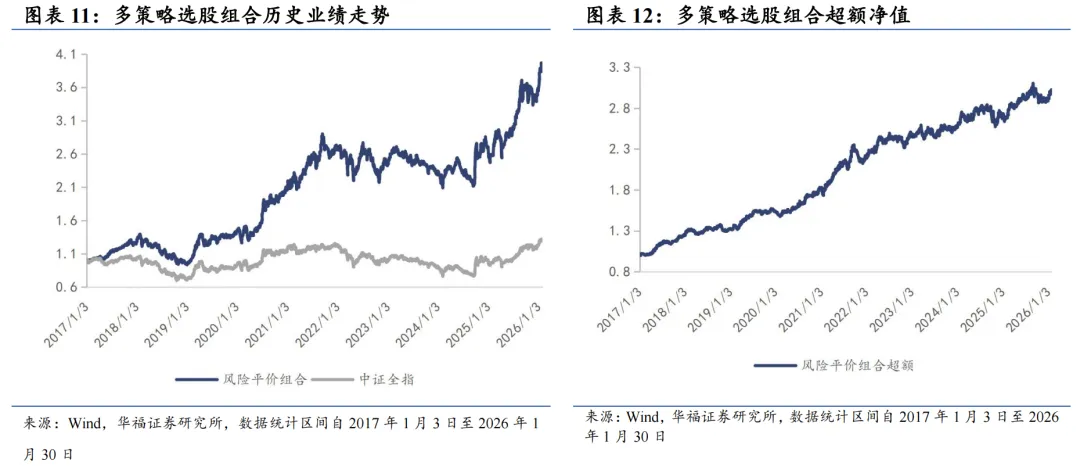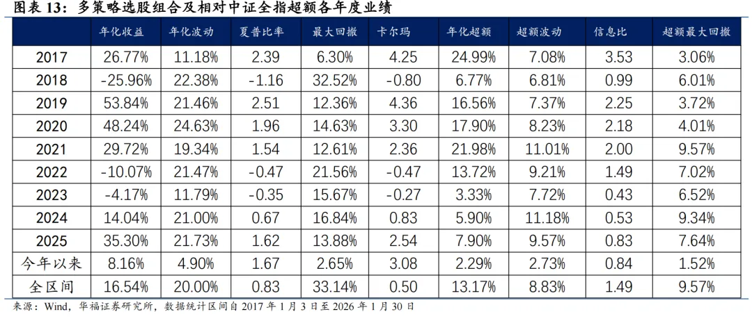 从多策略选股组合持仓的各风格暴露均值与风格因子收益上看,2026年1月持仓股票在中市值、市值、Beta、流动性、动量、杠杆、成长和估值上获得正收益。2026年1月的持仓在Beta、估值、成长、流动性、中市值、动量和波动率因子上呈正向暴露,而在盈利、杠杆和市值因子上呈负向暴露。 2026年2月份最新持仓的因子暴露情况相比2026年1月存在一定变动,相对于2026年1月份,持仓在杠杆上的暴露由负转正;在估值、中市值、动量和波动率上的正向暴露有所放大,在Beta和流动性上的正向暴露有所收敛。持仓在成长上的暴露由正转负,在市值上的负向暴露有所放大,在盈利上的负向暴露有所收敛。 多策略选股策略组合相对中证全指指数超额收益显著,各年度超额表现相对稳定。从年化收益表现上看,策略取得不错的收益表现,相对于中证全指指数自2017年初至2026年1月30日年化超额收益13.17%,信息比为1.49。