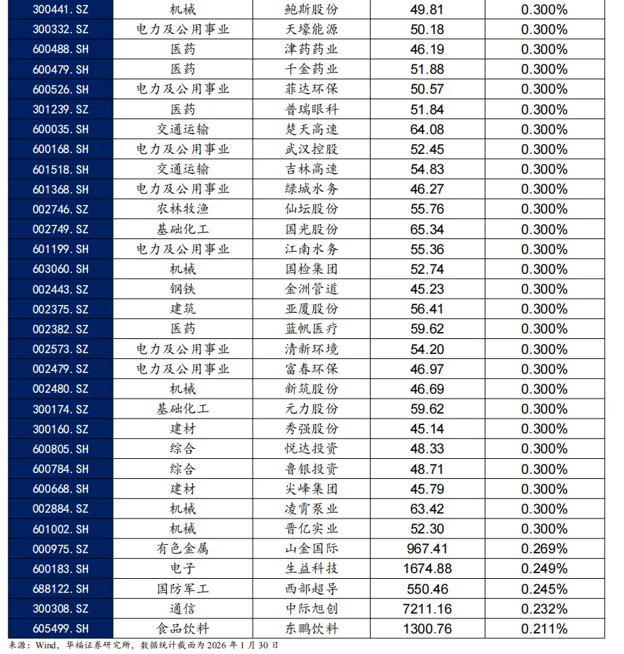 我们在传统的量价分析方法的基础上,结合量能和价能要素获得价量共振因子。同时,我们使用市场情绪评分LWMA240进行情绪择时。在此基础上,综合价量共振、波动、流动性、估值和ROE等因子筛选出具备这些因子特征的股票并进行因子打分。在此过程中,我们会根据LWMA240评分的正负调整情绪相关的因子打分方向并且规避了价量共振程度过高所带来的扰动以优化股票池。最终筛选出因子等权打分最高的50只股票构成情绪择时下价量选股策略。 根据情绪评分模型,自2025年12月31日至2026年1月30日区间内,触发-2分标签1次,触发2分标签8次。1月情绪平均分约为0.34,截止最新(2026年1月30日)情绪评分0.36,持续回暖。 截至2026年1月30日数据显示,2026年2月情绪价量策略推荐如下表,其中包含50只股票。最新持仓股票平均市值381.44亿元,中信一级行业在机械、电子上分布相对集中,分别占24%、20%。其次是有色金属和汽车,分别占12%、10%。