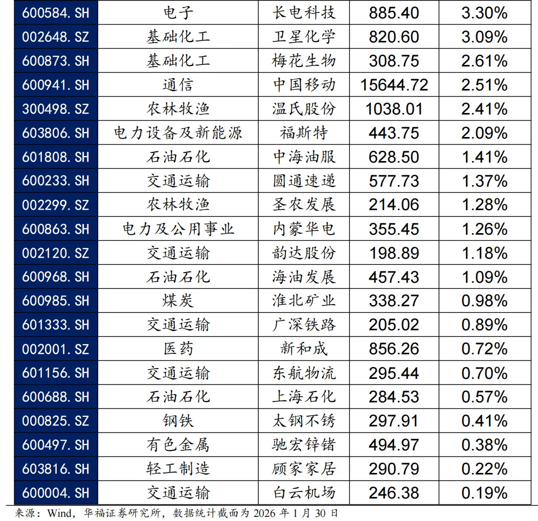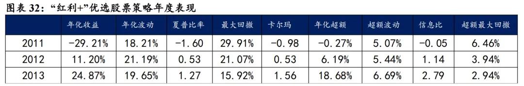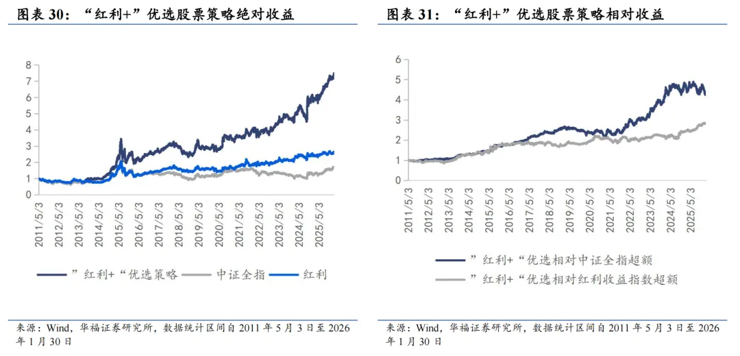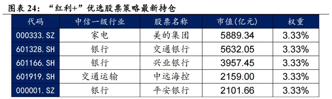我们在红利策略的基础上,根据股息率要素筛选出“红利+”优选的股息率增强股票组合。根据股票的波动、ROE、估值和盈利增长等因子,筛选出具备该因子特征的股票。同时满足几类因子特征的股票被定义为“红利+”优选股票池。在此基础上,我们为规避股票组合中较小市值股票权重占比过高带来的风格偏移,我们仅从优选股票池中中证800指数和中证1000指数的成分股中挑选高股息标的,最终筛选出30只股票构成“红利+”优选股票策略。