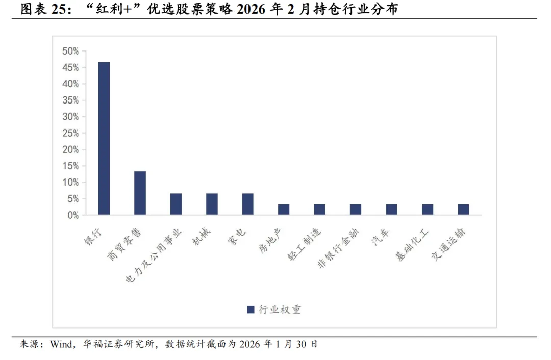 根据模型最新结果,2026年2月红利+选股策略推荐如下表。最新持仓股票平均市值1104.10亿元,中信一级行业在银行上分布相对集中,分布占46.67%。其次是商贸零售,占到13.33%。