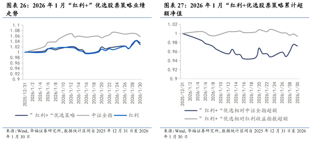 2026年1月,“红利+”优选股票策略绝对收益2.81%,相对中证全指指数超额收益-2.78%,相对红利收益指数超额收益-0.64%。2026年以来截至1月30日,“红利+”优选股票策略绝对收益2.81%,相对中证全指指数超额收益-2.78%,相对红利收益指数超额收益-0.64%。从组合各风格暴露均值与风格因子收益上看,2026年1月持仓股票在盈利、波动率、中市值、市值、成长和估值暴露上取得了正向收益。2026年1月持仓在估值、盈利、成长、杠杆和中市值呈正向暴露,而在Beta、流动性、动量、市值和波动率上呈负向暴露。 2026年2月份最新持仓与2026年1月因子暴露情况存在差异,相对于2026年1月份,估值、盈利、成长和杠杆的正向暴露有所放大,在中市值的正向暴露有所收敛。在Beta、流动性、动量和波动率的负向暴露有所放大,在市值的负向暴露有所收敛。 “红利+”优选股票策略组合相对中证全指超额收益显著,各年度超额表现相对稳定。从年化收益表现上看,“红利+”优选股票策略取得不错的收益表现,2011年5月3日至2026年1月30日年化收益14.88%,相对于中证全指年化超额收益10.77%,信息比为1.03,相对于红利收益指数的超额收益为7.41%。05