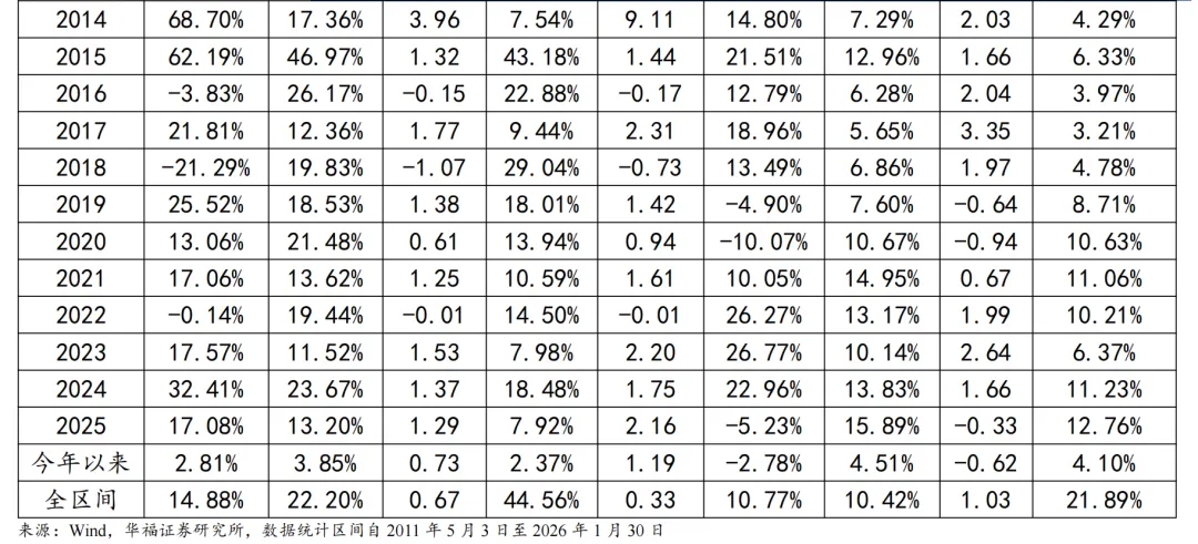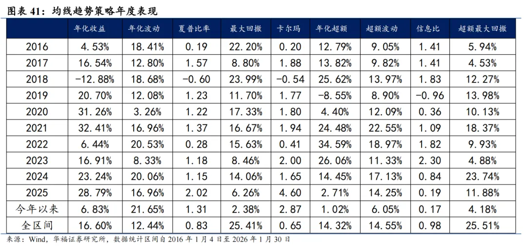2026年2月份最新持仓的因子暴露情况与2026年1月结构略有不同,在盈利因子上的正向暴露有所放大,而在估值、成长和市值因子上的正向暴露有所收窄。持仓在杠杆因子上的暴露由正转负,在Beta、动量和波动率因子上的负向暴露有所放大,在流动性和中市值因子上的负向暴露有所收敛。 均线趋势策略相对中证全指超额收益显著,各年度超额表现相对稳定。从年化收益表现上看,增强策略取得不错的收益表现,2016年初至2026年1月30日年化收益16.60%,相对于中证全指自2016年初至2026年1月30日年化超额收益14.32%,信息比为0.98。2026年以来策略绝对收益为6.83%,相对中证全指超额收益1.02%。06