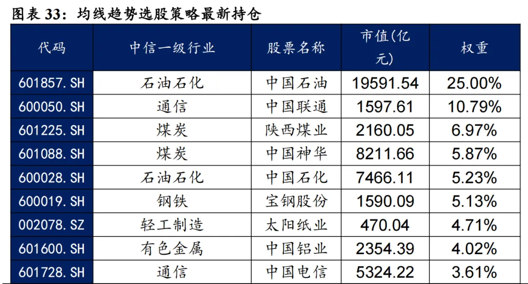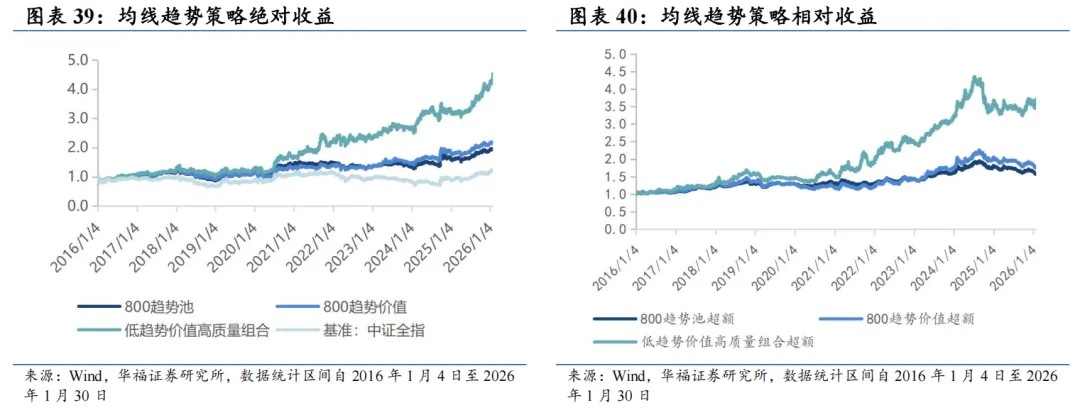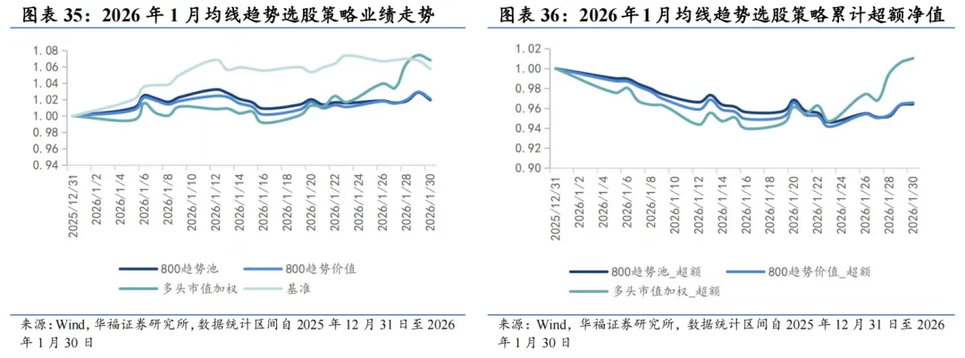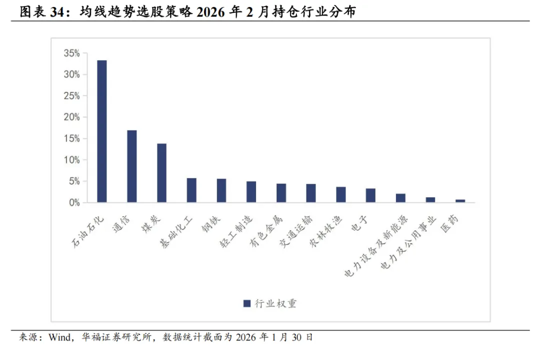 我们认为均线的相对位置可以象征趋势和反转状态,时间周期短的均线反映最新的价格走势变化,周期长的均线可以更好的过滤噪音,那么短均线与长均线位置的相对高低可以表征股价所处的趋势状态。因此我们以中证800作为基础股票池,根据“(20日均线-240日均线)/20日均线”因子作为趋势强度的因子,采用流通市值加权法划分高低趋势组,认为低趋势组可能处于拉涨初期,后续存在长期趋势收益。在低趋势组中采用质量因子等权打分选取前33支股票作为持仓。 截至2026年1月30日数据显示,2026年2月均线趋势策略推荐如下表。最新持仓股票平均市值2454.95亿元,中信一级行业在石油石化分布相对集中,占33.30%,其次为通信,占16.90%。 本报告对该策略的统计区间为2025年12月31日至2026年1月30日。2026年1月,均线趋势策略绝对收益6.83%,相对中证全指超额收益1.02%。 从投资组合各风格暴露均值与风格因子收益上看,1月持仓股票主要在盈利、波动率、成长和估值上获取正向收益。1月持仓在估值、盈利、成长、杠杆和市值上呈正向暴露,而在Beta、流动性、中市值、动量和波动率因子上呈负向暴露。