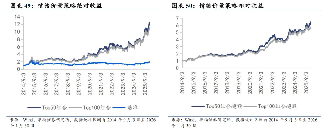 2026年1月,情绪价量策略top50组合绝对收益10.14%,相对中证全指指数超额收益4.15%。top100组合绝对收益7.61%。相对中证全指指数超额收益1.76%。2026年以来截至1月30日,情绪价量策略top50组合绝对收益10.14%,相对中证全指指数超额收益4.15%;top100组合绝对收益7.61%,相对中证全指指数超额收益1.76%。 从组合各风格暴露均值与风格因子收益上看,1月持仓股票在流动性、中市值、市值、Beta、动量、杠杆和成长的风格暴露上取得了正向收益。1月持仓在Beta、成长、流动性、中市值、动量和波动率上呈正向暴露,而估值、盈利、杠杆和市值上呈负向暴露。 2026年2月份最新持仓与2026年1月因子暴露情况存在差异,相对于2026年1月份,Beta、流动性和波动率上的正向暴露有所收敛,在中市值和动量上的正向暴露有所放大。在成长因子上的暴露由正转负,在估值、杠杆和市值的负向暴露有所收敛,在盈利因子上的负向暴露有所放大。 情绪价量策略相对中证全指超额收益显著,各年度超额表现相对稳定。从年化收益表现上看,情绪价量策略取得不错的收益表现,2014年9月3日至2026年1月30日top50组合年化收益25.43%,top100组合年化收益24.00%;相对于中证全指自2014年9月3日至2026年1月30日top50组合年化超额收益18.32%,信息比为1.16,top100组合年化超额收益16.97%,信息比为1.17。07