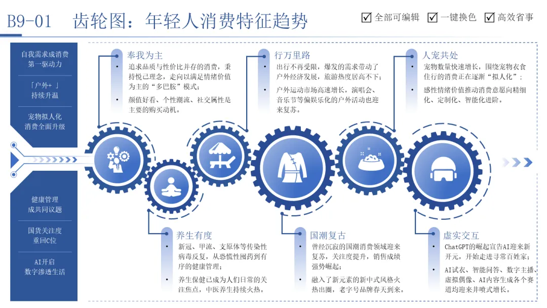 年轻人消费特征趋势齿轮图精准捕捉了当代年轻人的六大消费驱动力:“奉我为主”、“行万里路”、“人宠共处”、“养生有度”、“国潮复古”、“虚实交互”。这六个齿轮紧密咬合,共同构成了新一代消费市场的动力系统。它清晰地揭示,今天的消费市场不再是单一需求驱动,而是由自我实现、情感陪伴、健康关注、文化认同、技术体验等多重价值观交织驱动的复合生态。
