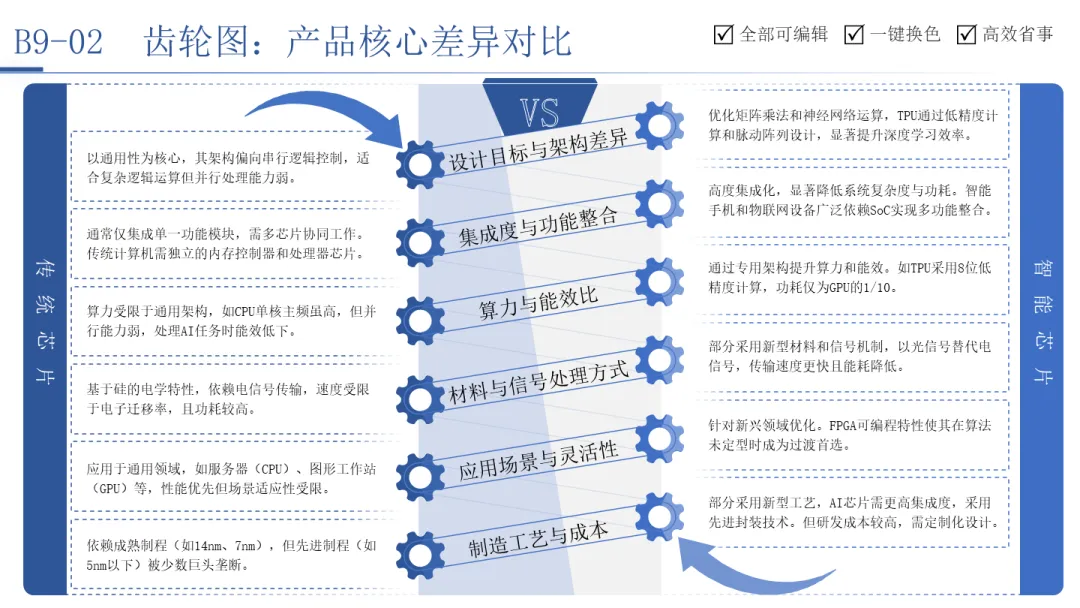 产品核心差异对比齿轮图则将传统芯片与智能芯片置于两个相互啮合又对立的齿轮上,从“制造工艺”、“设计架构”、“应用场景”等六个维度进行逐一对比。这种呈现方式,不仅展示了差异点,更暗示了两种技术路线在迭代中相互影响、彼此竞争的动态关系。