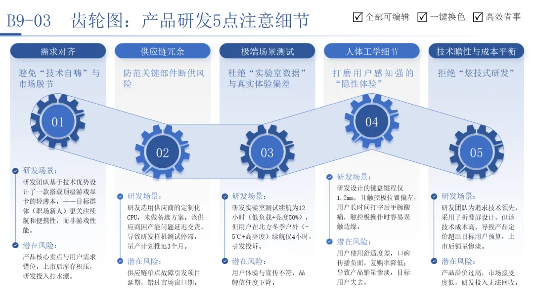 产品研发5点注意细节齿轮图则更具警示意义。它用五个相互关联的齿轮,分别代表“需求对齐”、“供应链冗余”、“极端场景测试”、“人体工学细节”和“技术前瞻与成本平衡”。任何一个齿轮的“卡顿”(如需求错位或供应链断裂),都会通过传导影响整个研发系统的顺畅运转,最终导致产品失败。这张图有力地说明了,成功的产品研发是一个系统工程,任何一个环节的短板都可能成为致命的瓶颈。