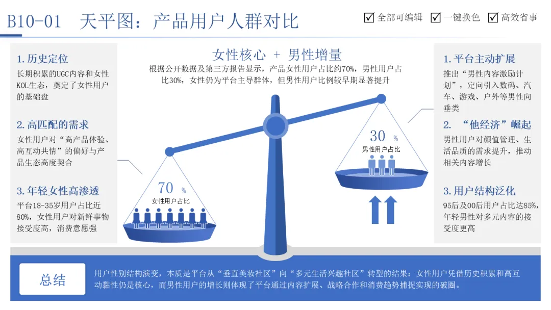 产品用户人群对比天平图直观展示了平台用户性别结构的“三七开”比例,并用“女性核心+男性增量”来定义这种结构。天平图下方的原因分析,则解释了这种比例形成的深层逻辑:是平台从垂直社区向多元生活社区转型的结果。这张图不仅展示了“是什么”,更回答了“为什么”,呈现了数据表象背后的战略动因。