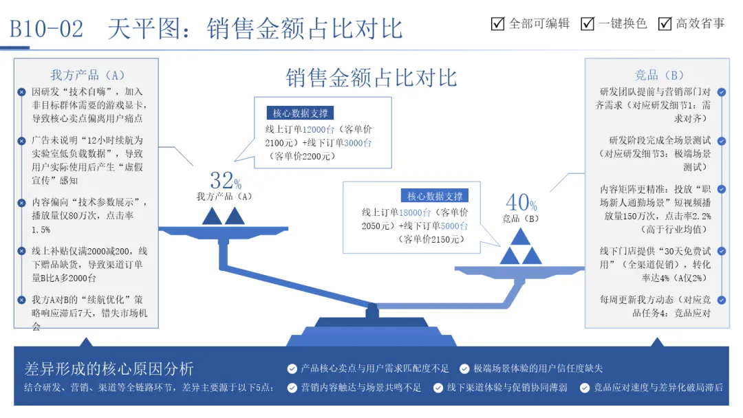 销售金额占比对比天平图则用于直接的竞争分析。它将我方产品与竞品的销售额占比放在天平两端,清晰显示差距。下方的归因分析直指五大核心环节(研发、营销、内容、渠道、竞对应对),并将我方劣势与竞品优势具体化(如“技术自嗨” vs “需求对齐”)。这种对比强烈地指出,市场份额的倾斜不是偶然,是全链路各环节执行力差异的综合体现。